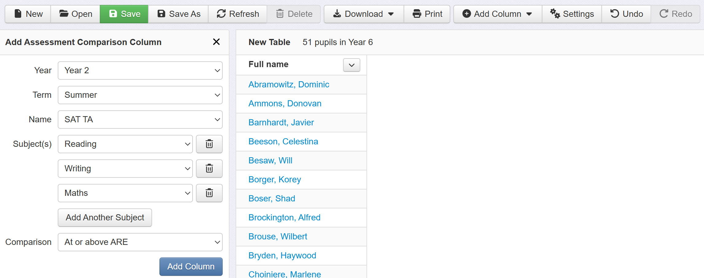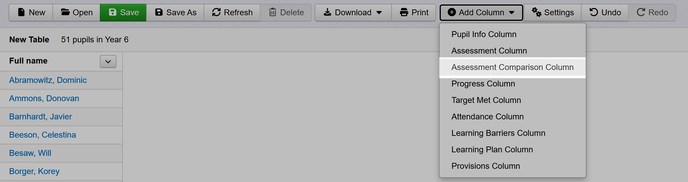 As shown in our other help guide you can add columns of pupil characteristics information or assessment data, but here we are going to go straight to adding an Assessment Comparison column.