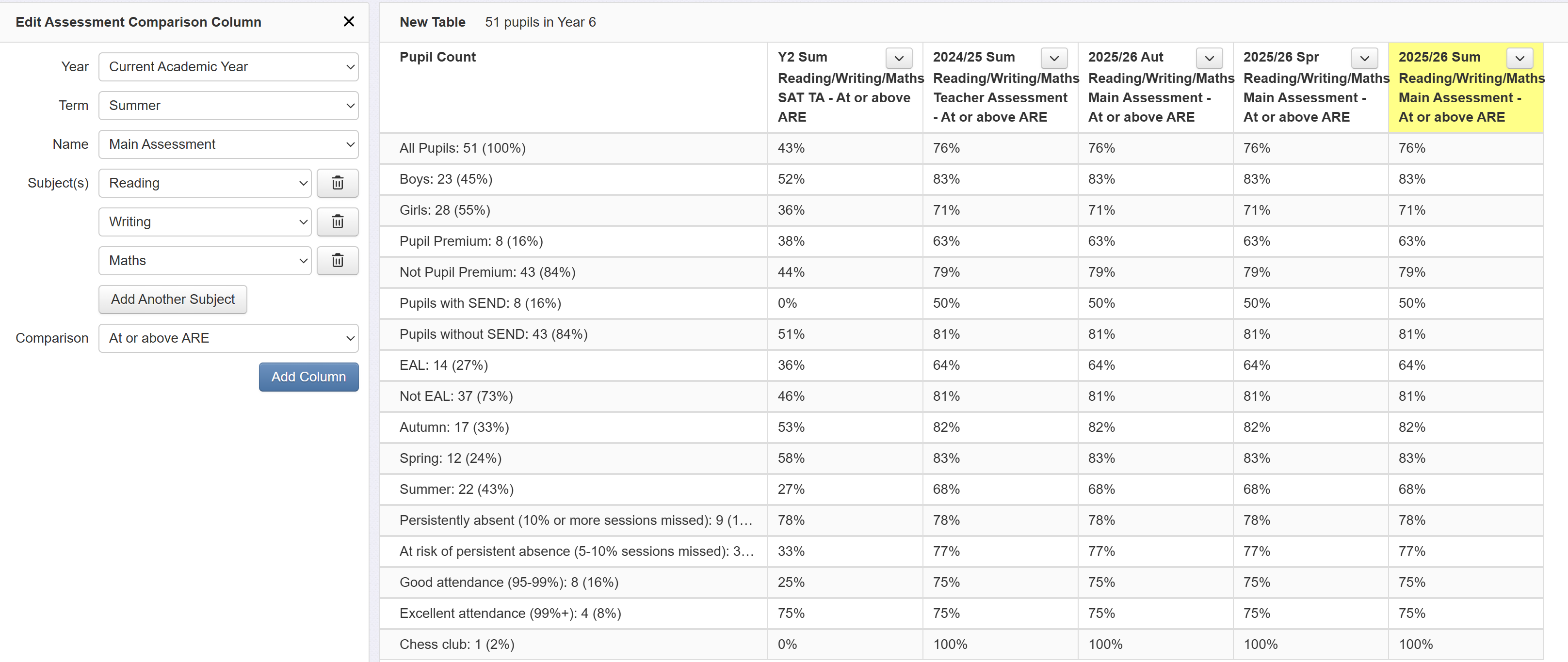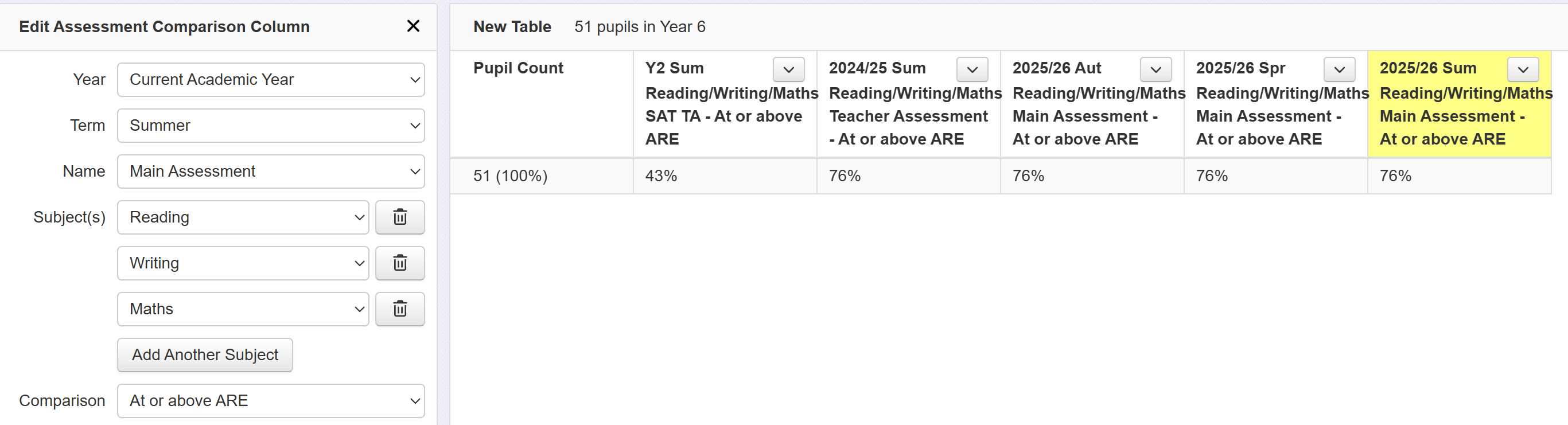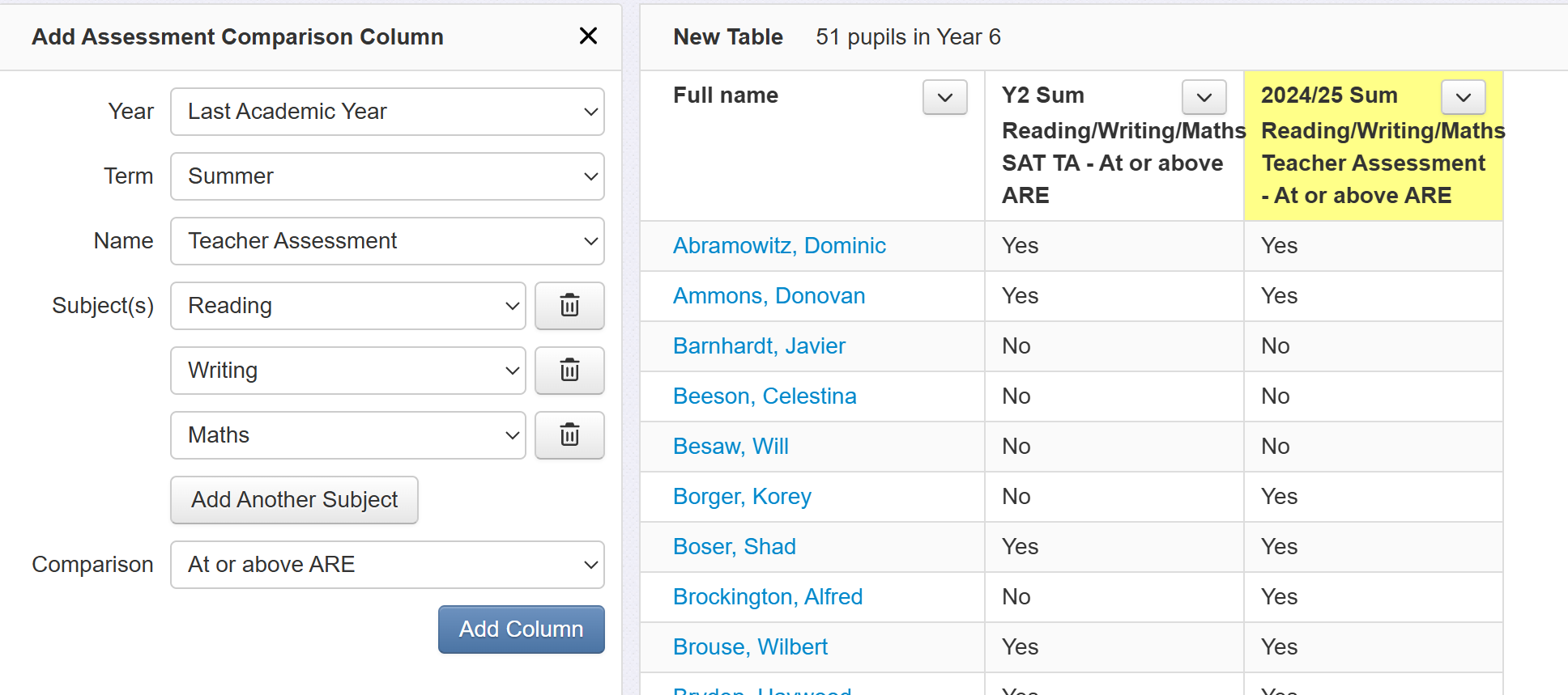 Click 'Add Another Column' and repeat the process, adding in a column for last summer, again to indicate whether or not pupils met expectations in combined subjects. We've changed the year to 'Last Year' and the assessment is changed to our teacher assessments.