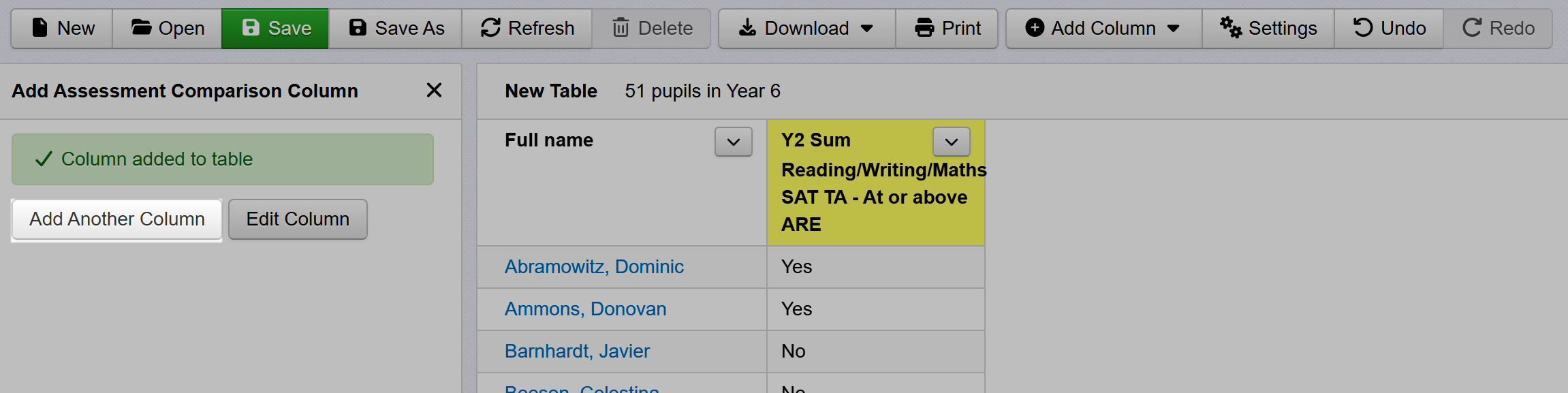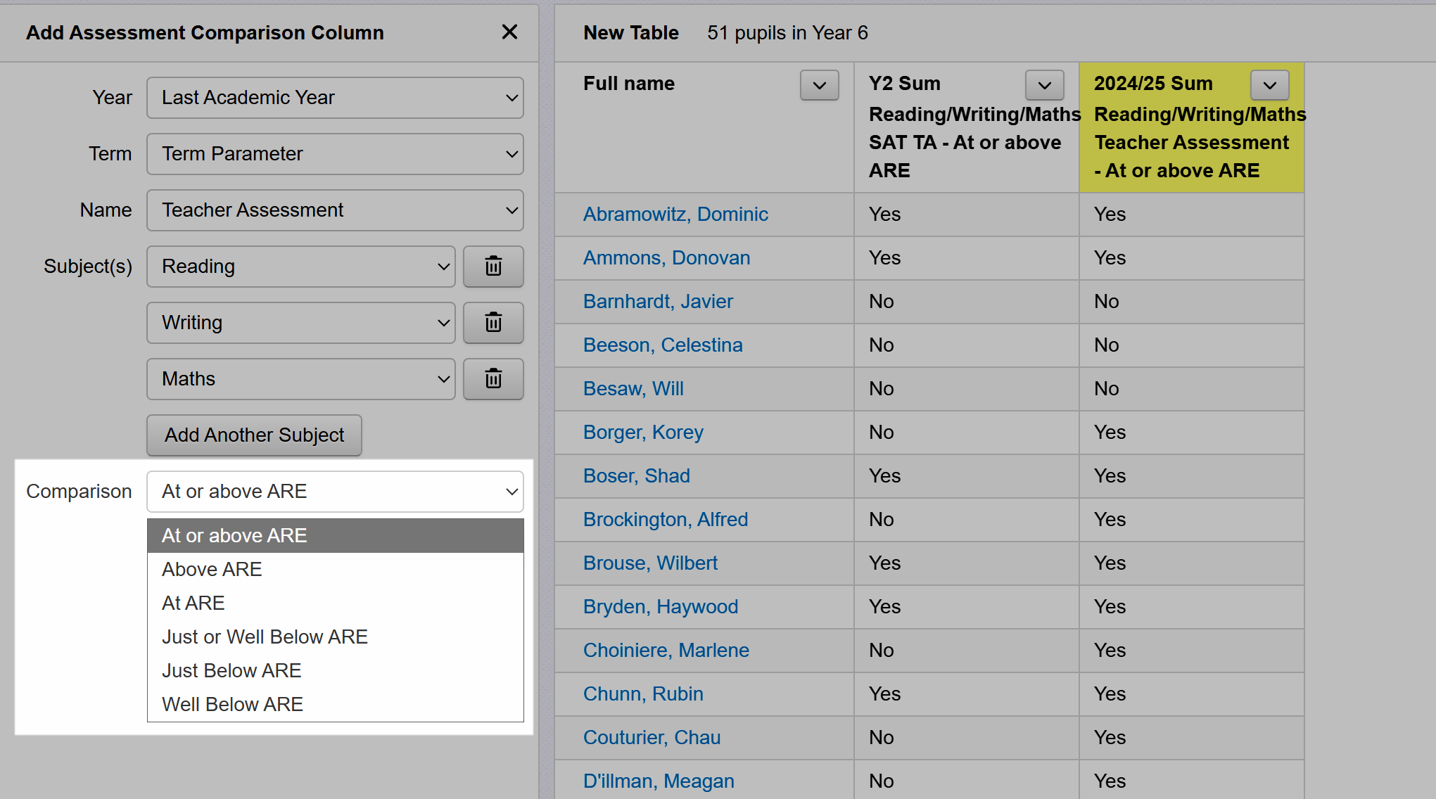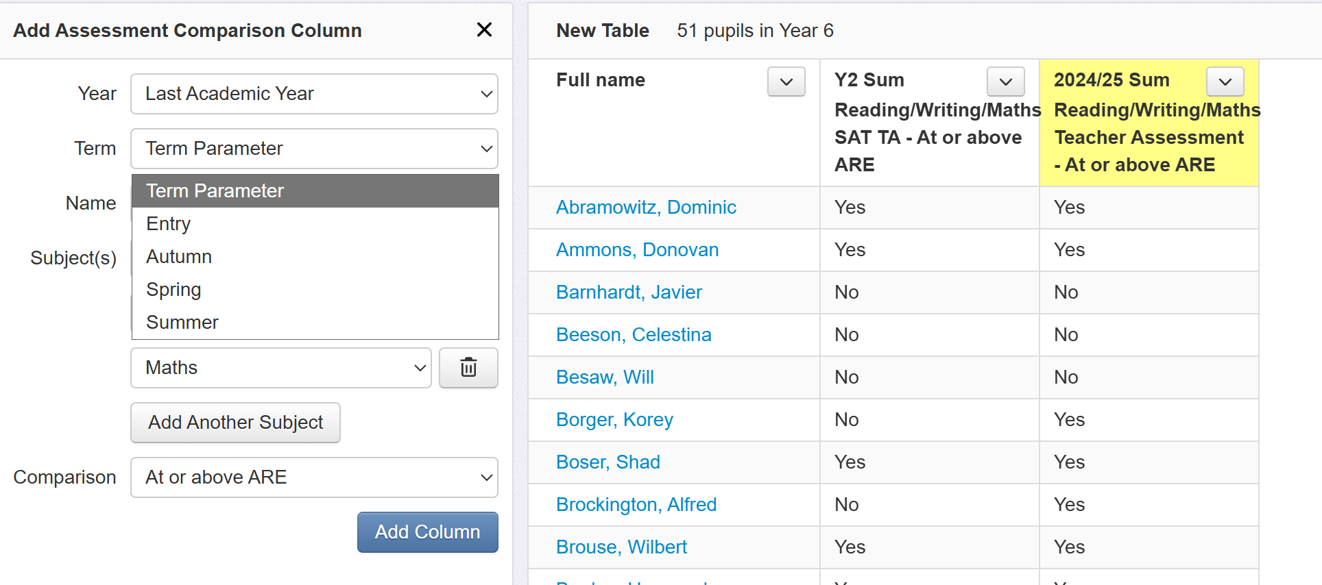 Click 'Add Another Column' and repeat the process, adding in a column for last summer, again to indicate whether or not pupils met expectations in combined subjects. We've changed the year to 'Last Year' and the assessment is changed to our teacher assessments.