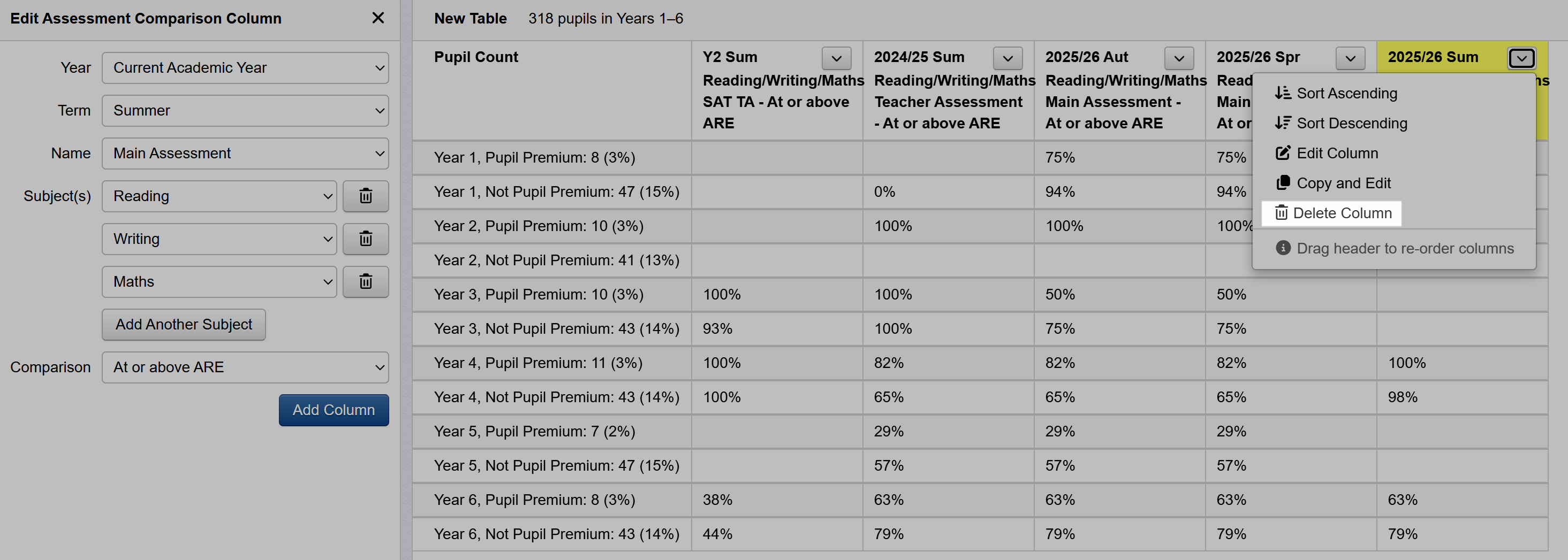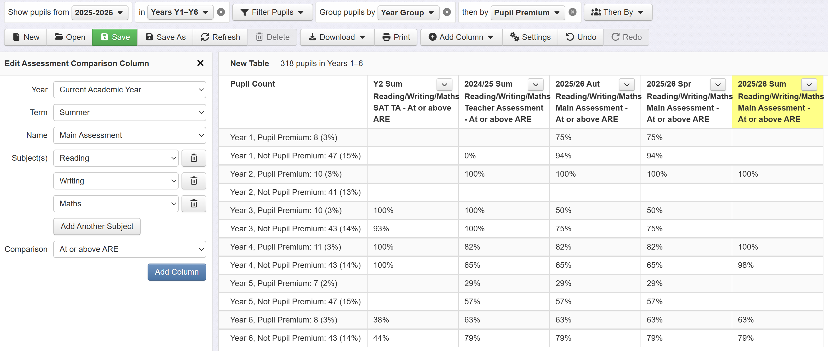 An Assessment Comparison Column will show whether a pupil is, for example, working at or above expectations in one or more subjects based on specified assessment data. At pupil level, this is shown as a simple yes/no value, which is converted to a percentage when aggregated to group or cohort level.