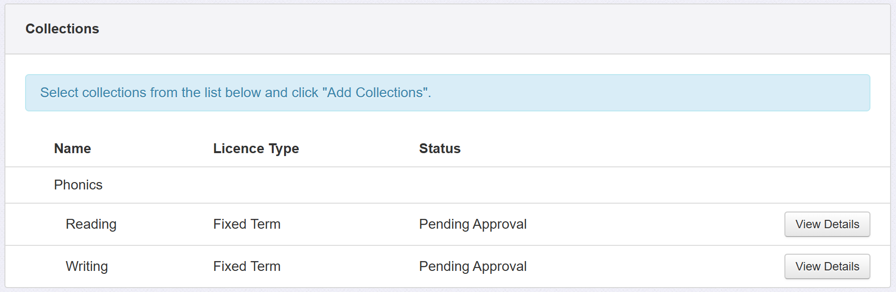 Some suppliers might have a large number of collections. Some of these (such as Development Matters) may be best added together. To select a whole group of collections, tick the box next to the heading to tick all collections in that group. You can also click any individual collections you'd like to add.