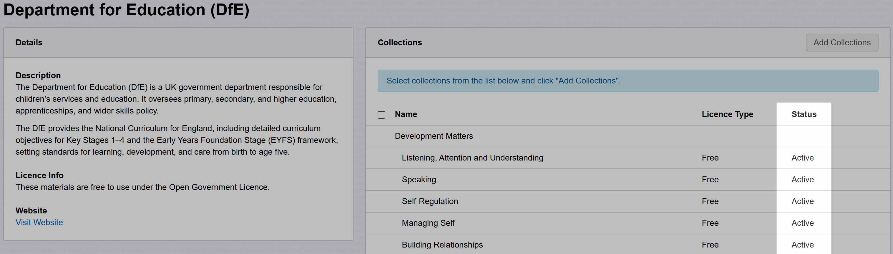 Click the name of the supplier with the free objective collection you want to add, for example, Department for Education (DfE).