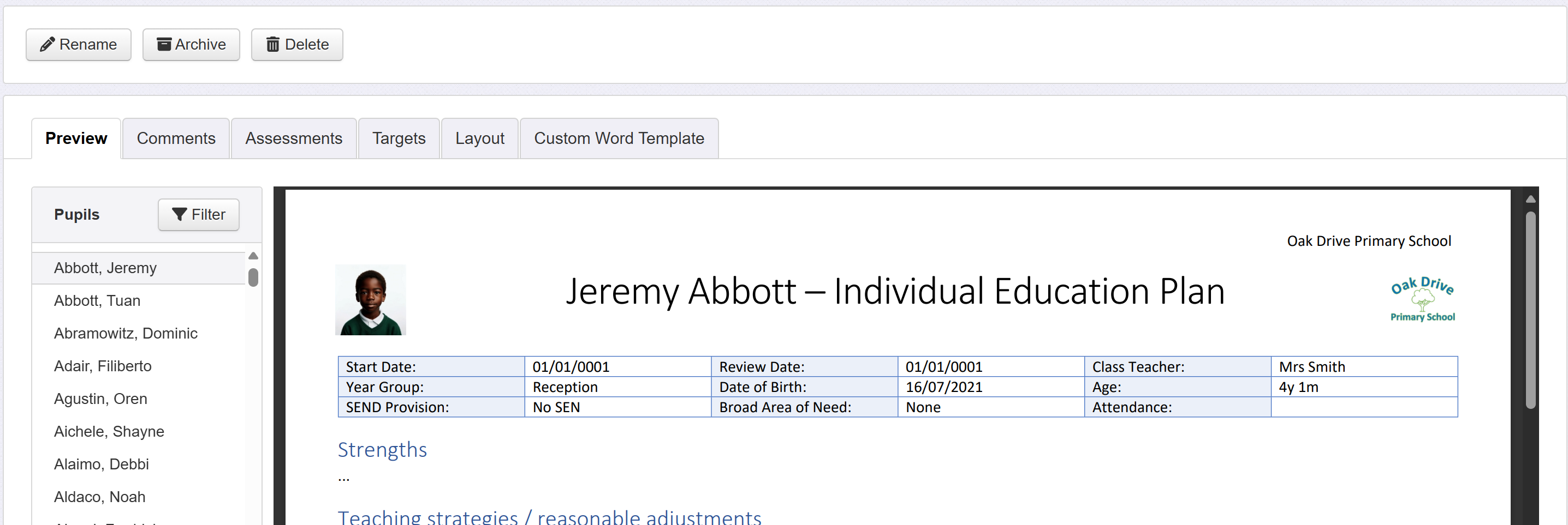 You can choose which pupil to preview, on the left. If you choose a pupil who has an active plan using the selected template, it will be displayed. If you choose a pupil who does not have an active plan using the selected template, you'll still see a preview but content such as comments and assessments will be blank.