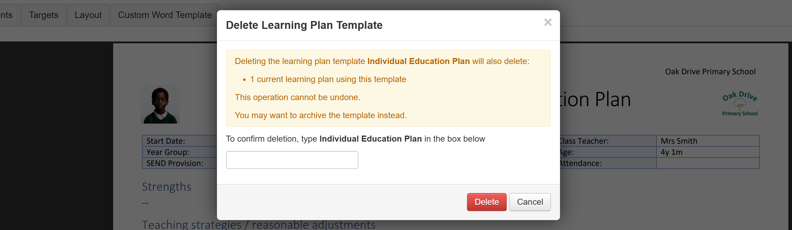 If there are no learning plans using the template, you will not be required to type the name, as there are much reduced implications for the deletion.