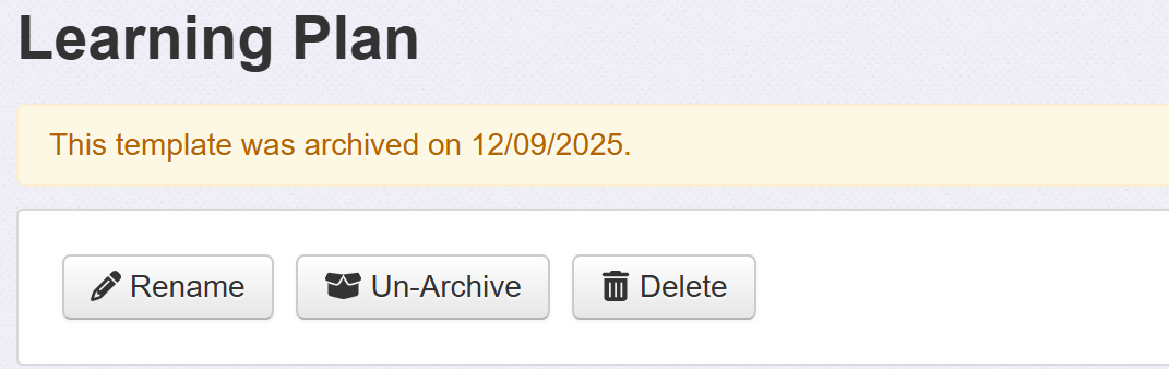 You can also Archive the template. Archived templates are not available for any new learning plans, but any active plans will remain. This may be useful if you create several templates and want to tidy up, to make sure other staff use the intended template going forward.