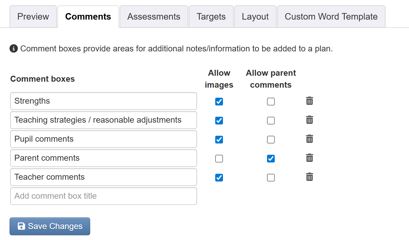 Use the trash icon to delete a comment box. Then click Save Changes when complete.