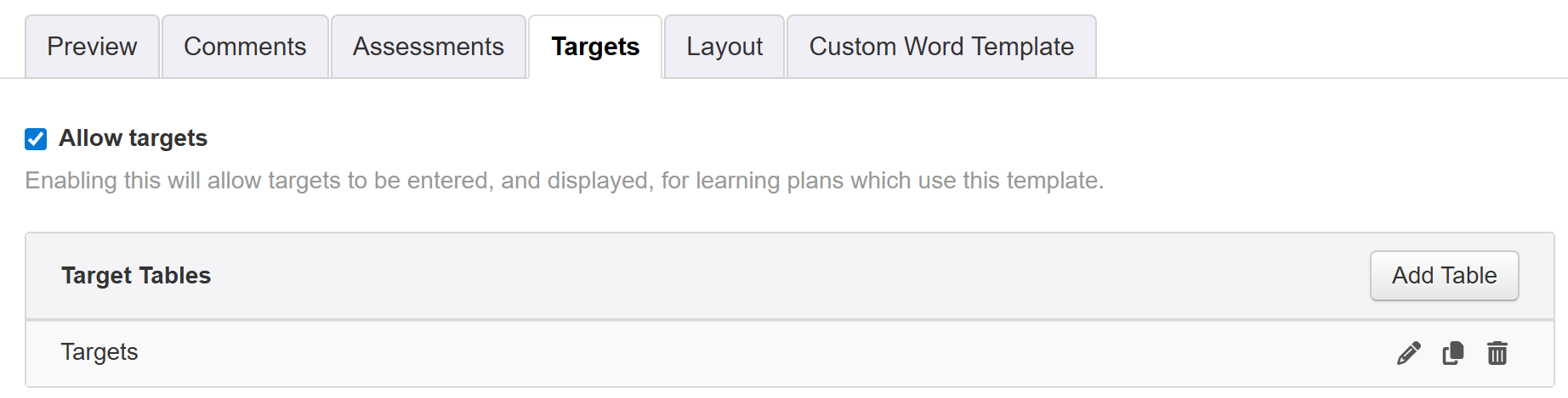 The Allow targets tick box, at the top, allows you to decide if you'd like any Targets tables in your plan.