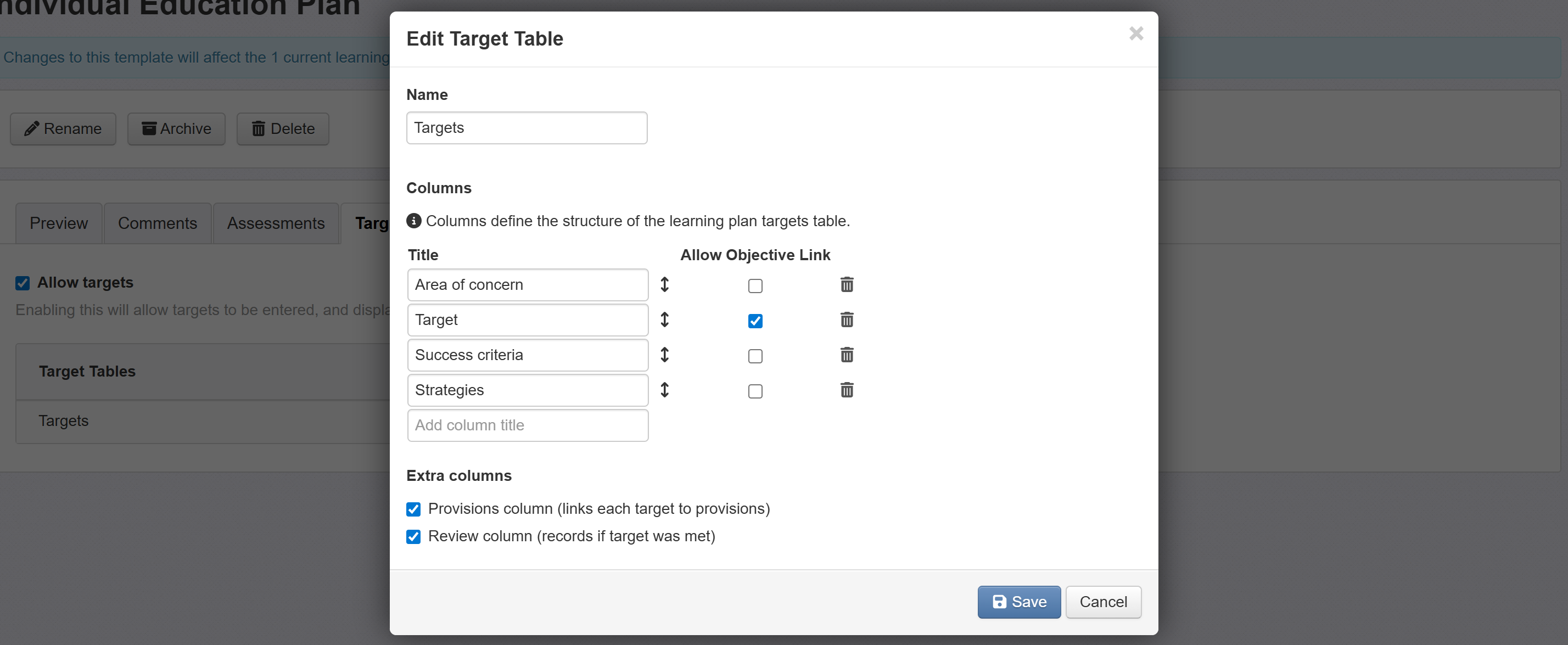 Learning plan templates can have multiple target tables. For example, if you want a whole year template you may want a separate target table for Autumn, Spring and Summer terms.