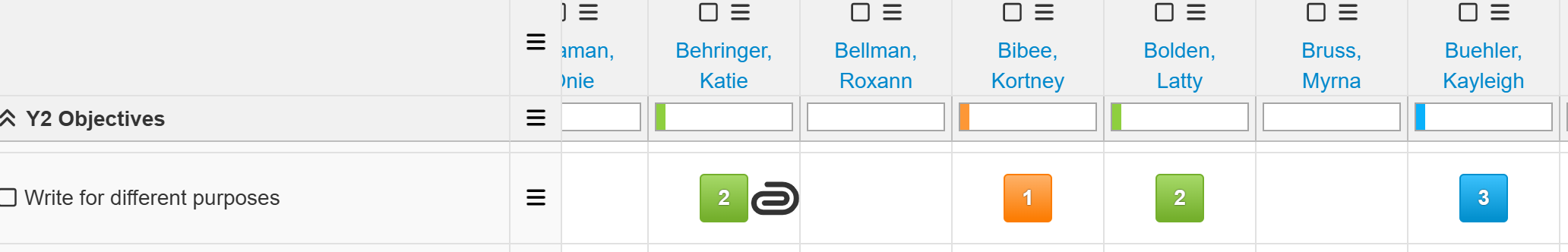 I’ve got all my pupils along the top and the objectives on the left. If any of your objectives have been set as Key Objectives, they’ll be in bold text.