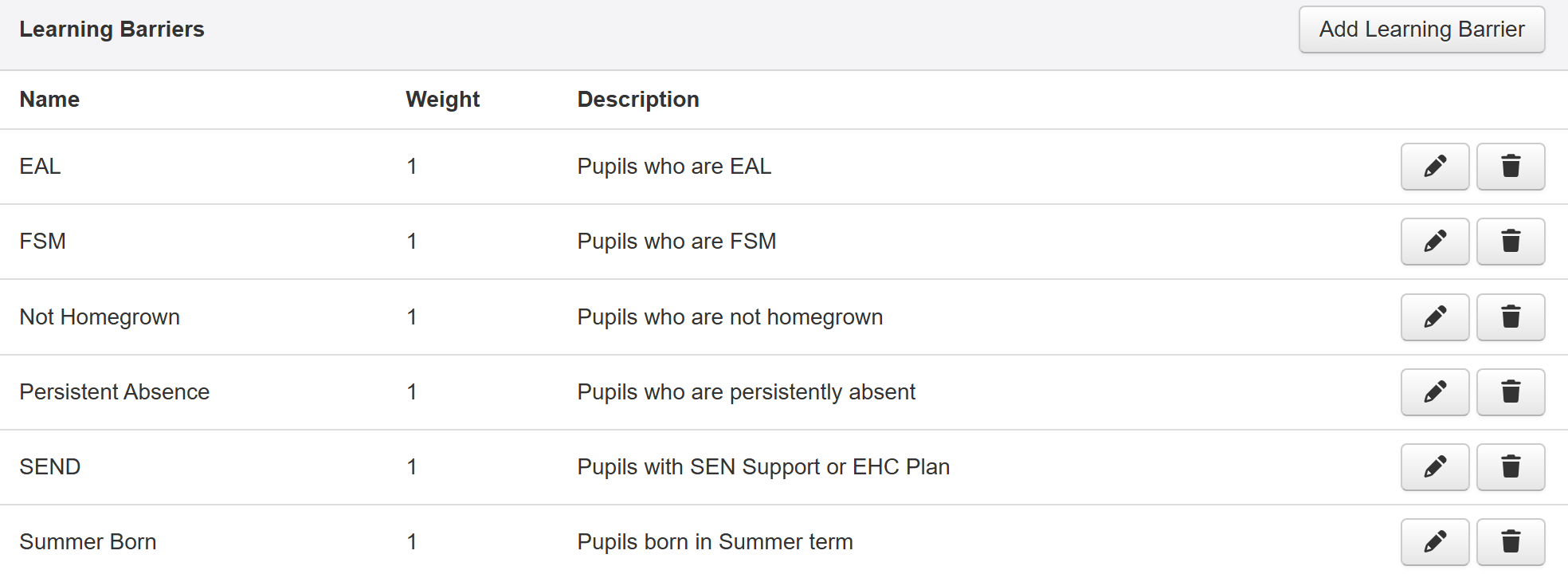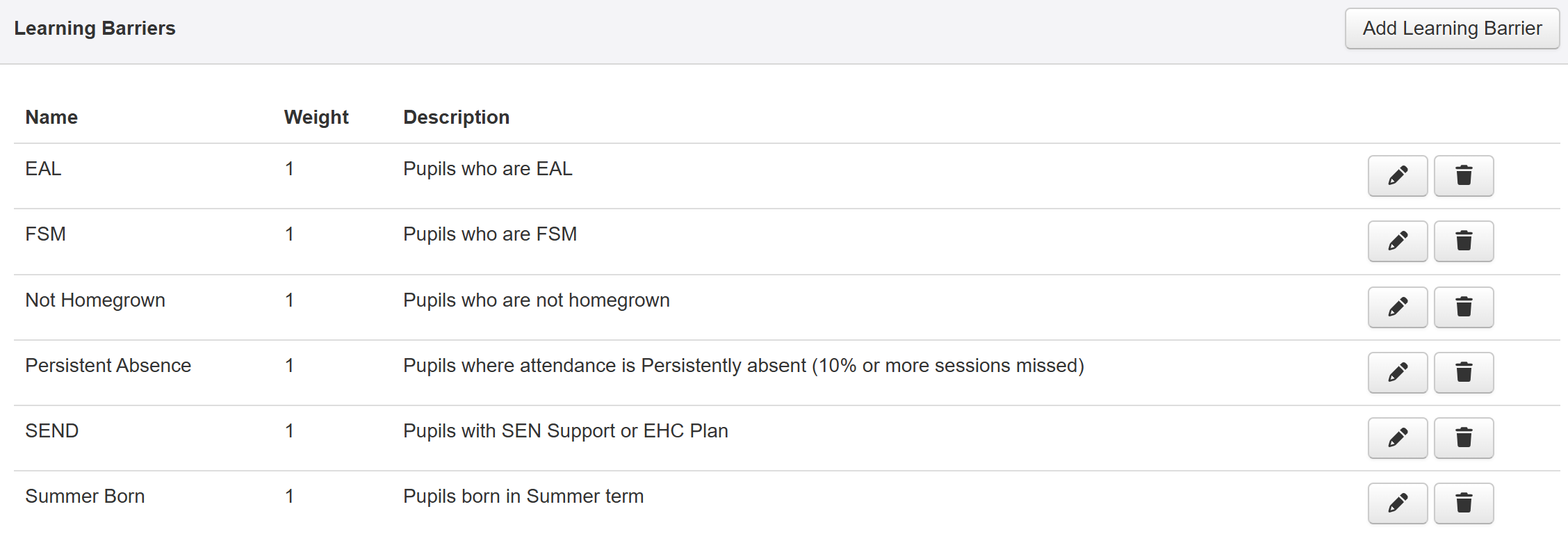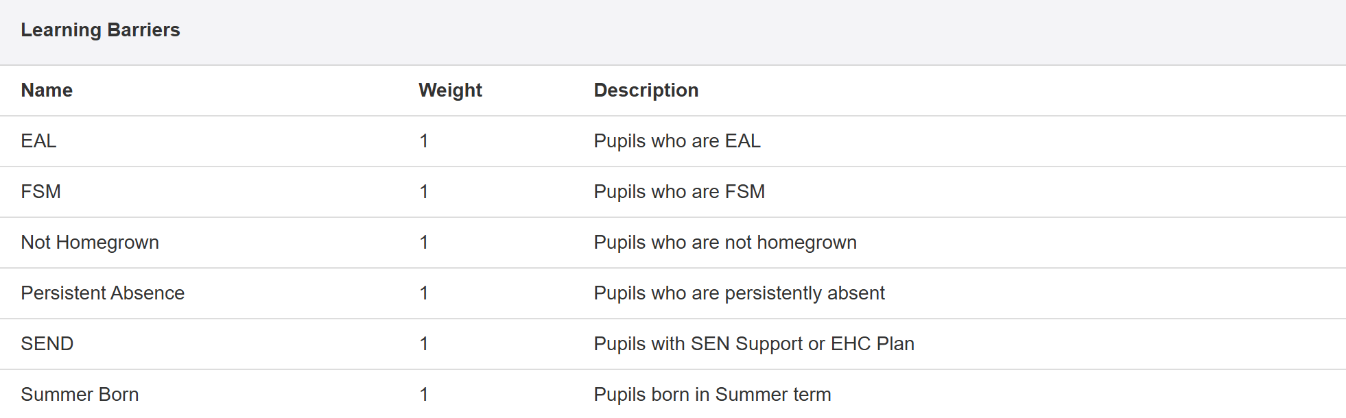 Each is given a weighting of 1, meaning a pupil will be given a score of 1 for any of the listed barriers they match. Their total score being the sum of those matches.