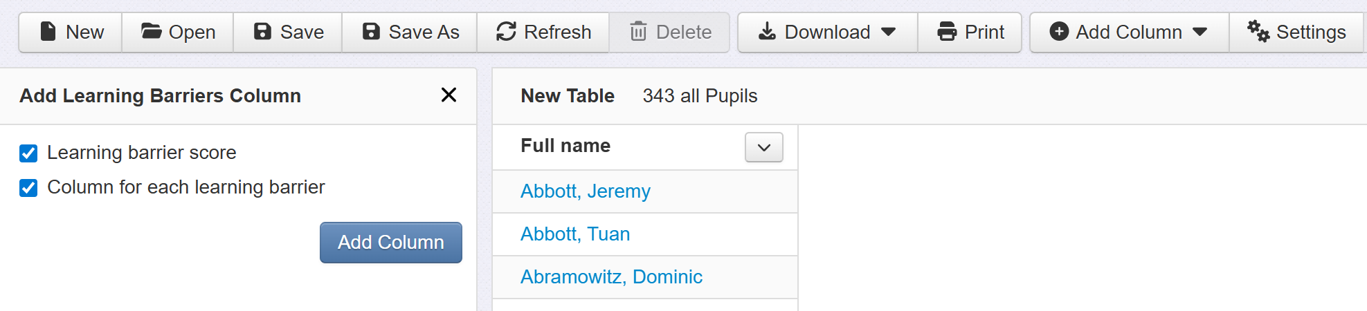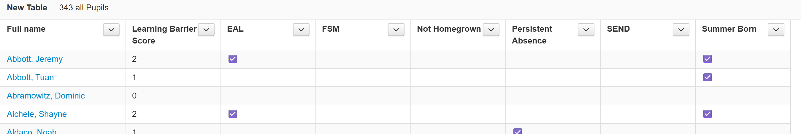 Adding learning barriers to a Table report allows you to see which of your learning barrier items each pupil matches, as well as their individual learning barrier score.