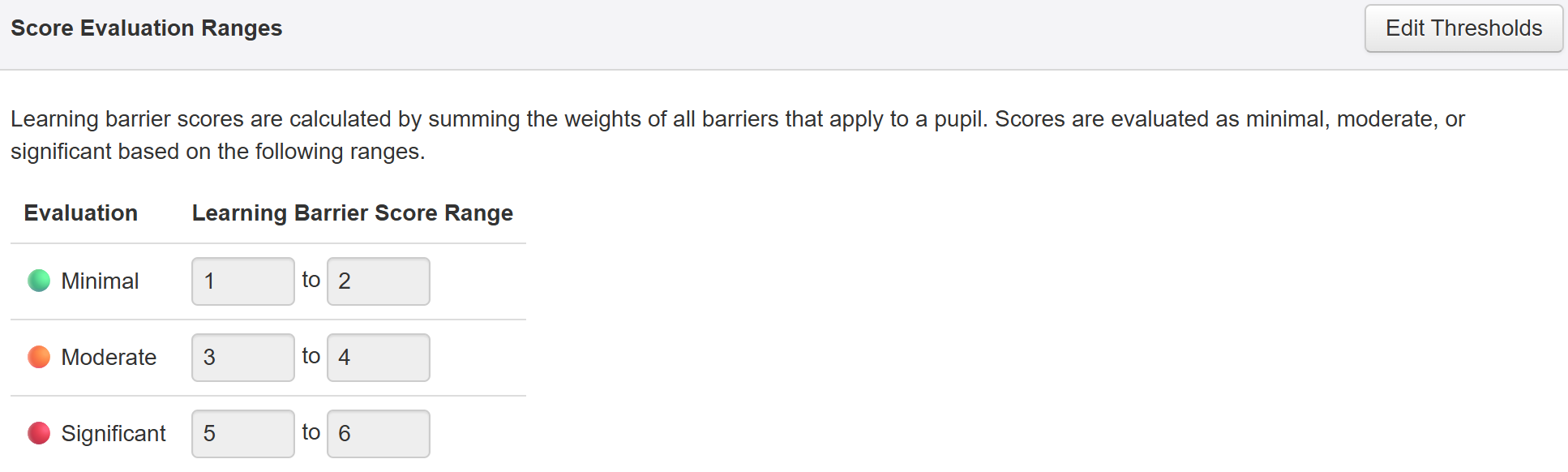 It is possible to filter and group pupils by their learning barrier score. Learning barriers are evaluated as follows by default: