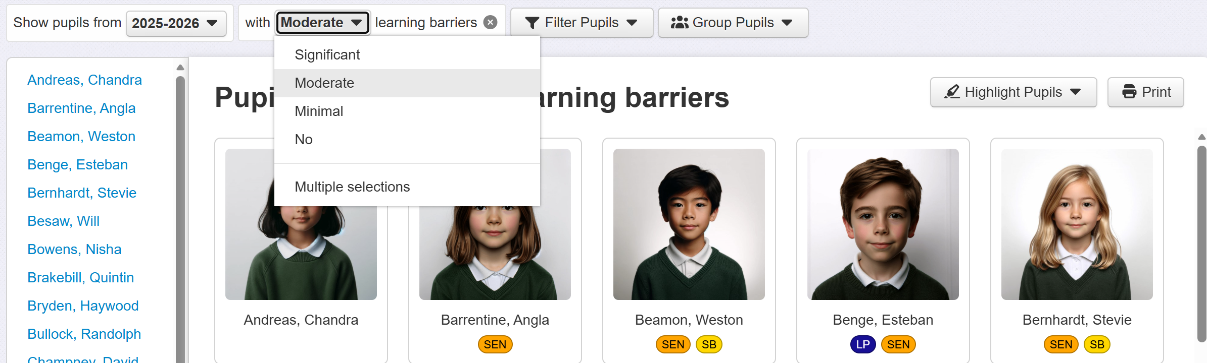 Pupils with minimal barriers to learning will be filtered by default. Click the menu to change this as required.