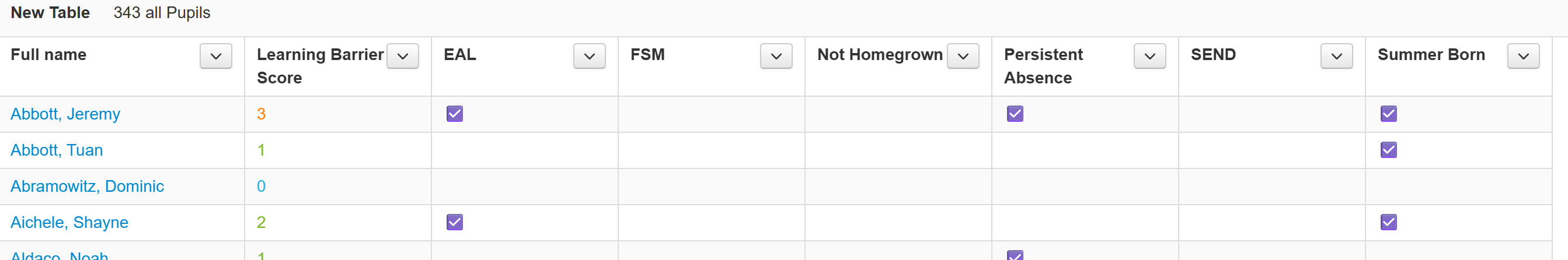 Learning barriers may also be added to Table reports. Either just as a score per pupil or to show all the criteria each pupil matches on.