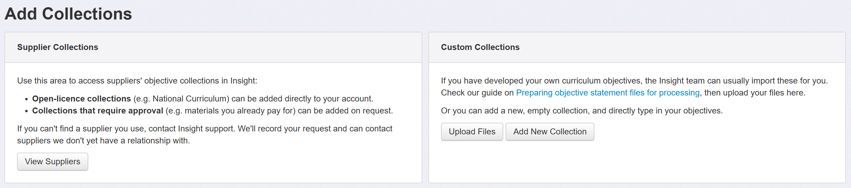 This guide details how to add Custom collections to Insight. Custom collections are for objectives that have been created by you (or your trust) and that have no commercial licence requirements. If in doubt, please get in touch.