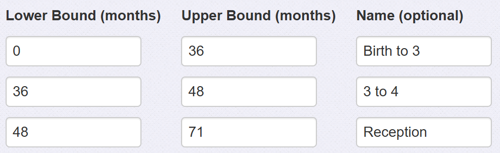 The Age Range mark scheme allows a list of age ranges/bands to be defined by their minimum and maximum ages, expressed in months.