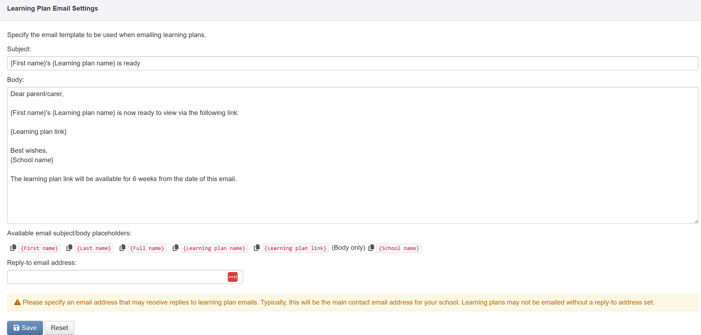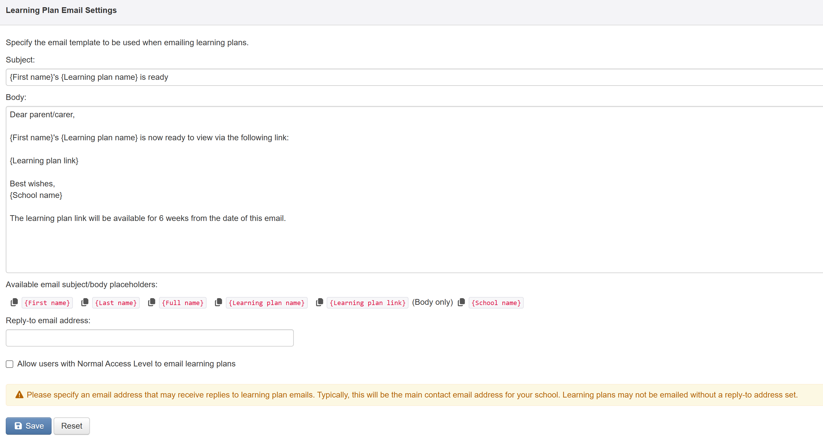 You must also stipulate a Reply-To email address. This is where any emails will be sent if parents reply to the email with the plan link in it.