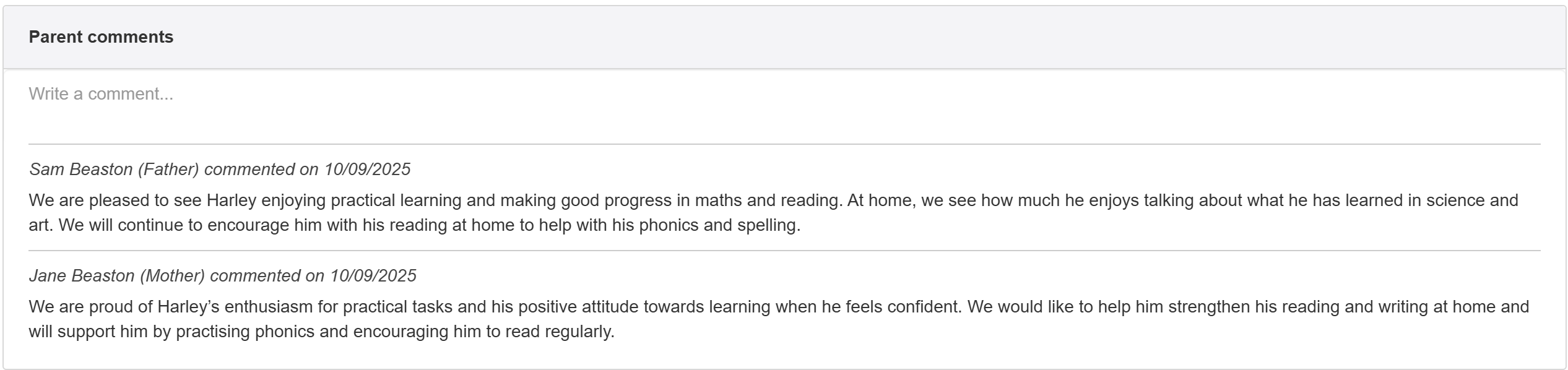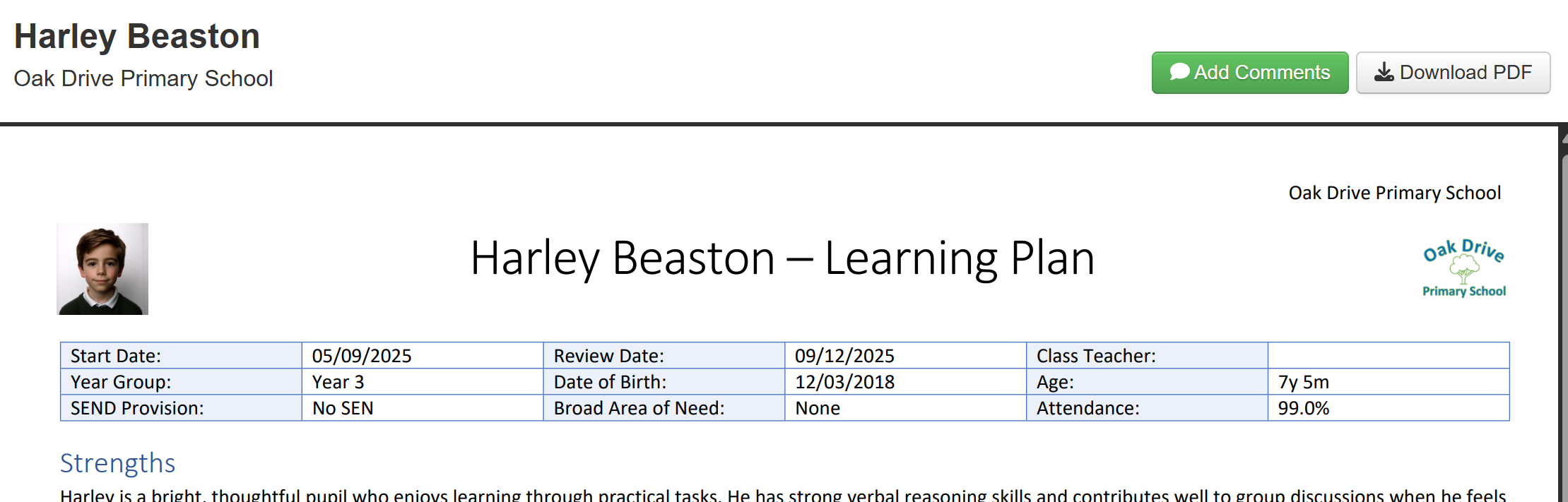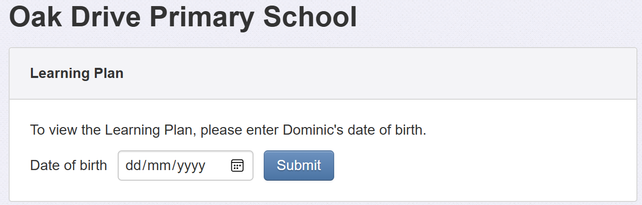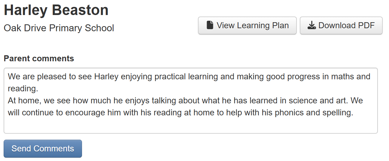 Once correctly entered, the parent will see a rendered version of the learning plan, including any graphics such as the school logo, pupil photo or any images that have been attached to any comments.