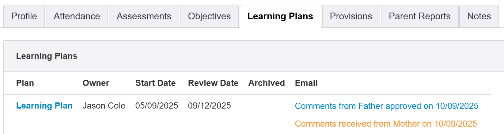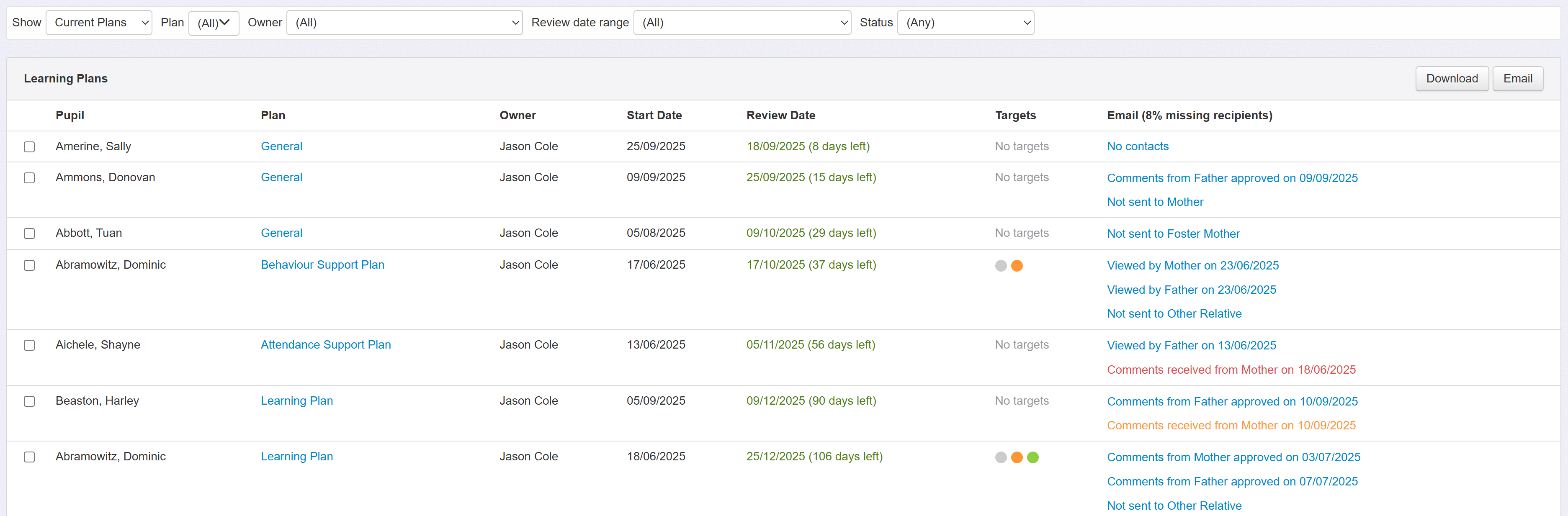 The Learning Plans report will indicate, in the Email column, all the different statuses for sent learning plans. This includes any received comments that need reviewing. You can click the Plan link in the report to open that plan for that pupil.