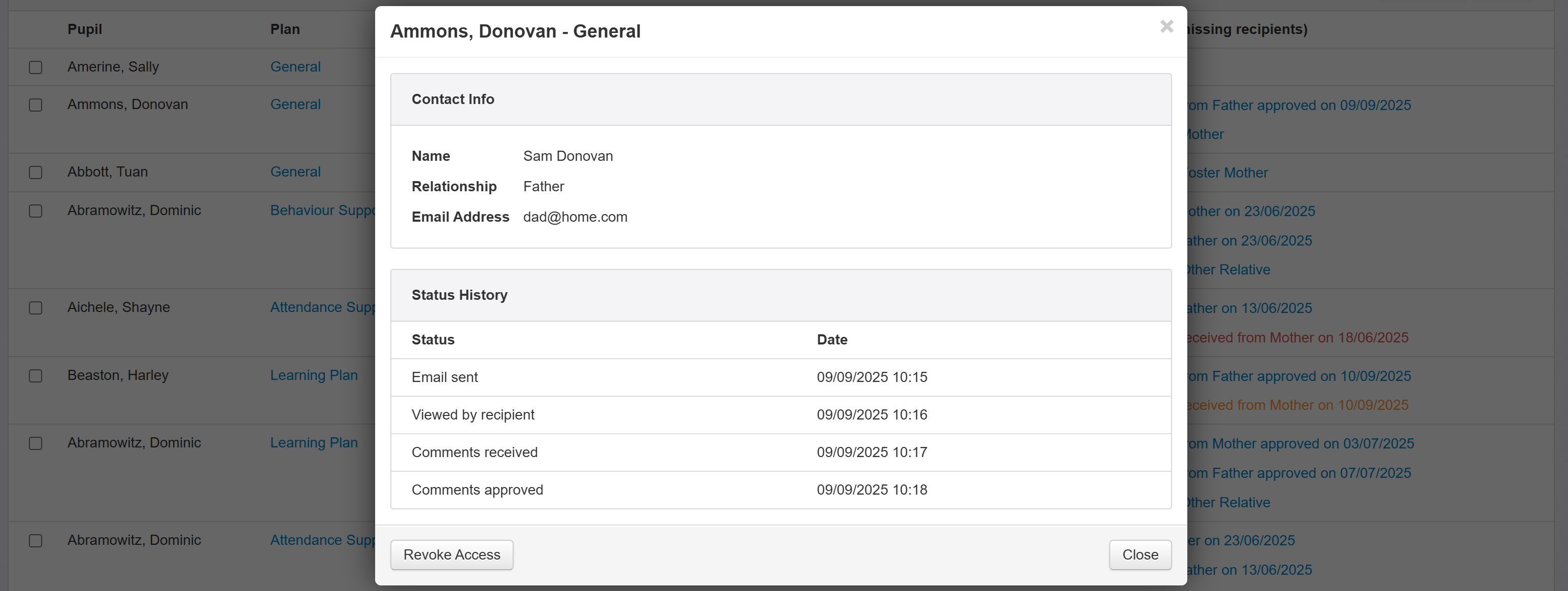 The pupils will be shown, along with the plan name contact recipient relationship and name (if Insight has no name recorded, their email address will be shown here instead), their email address and the status.
