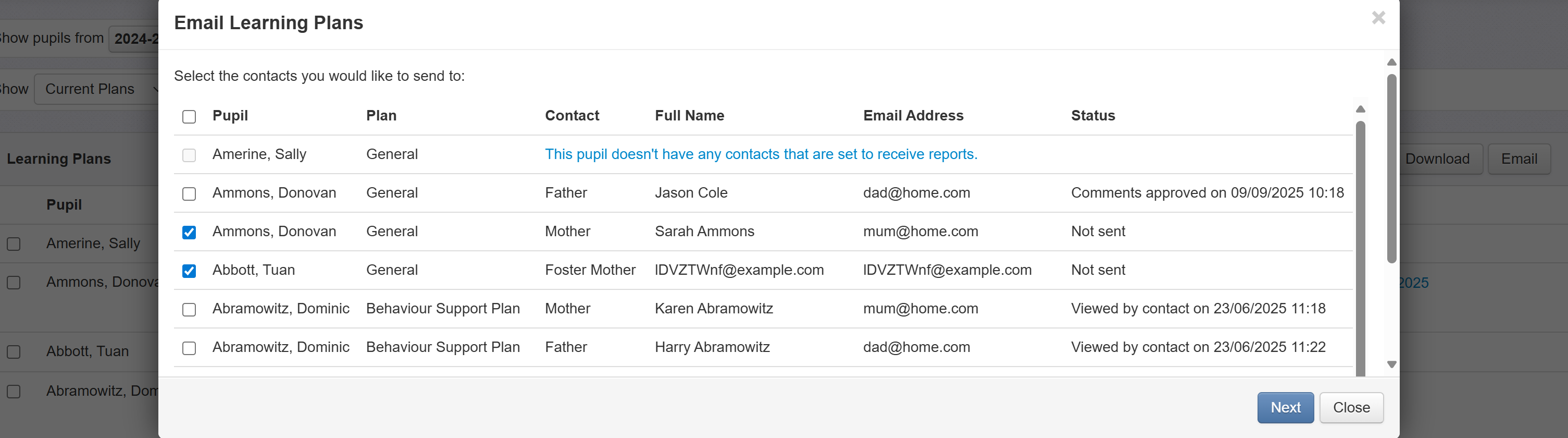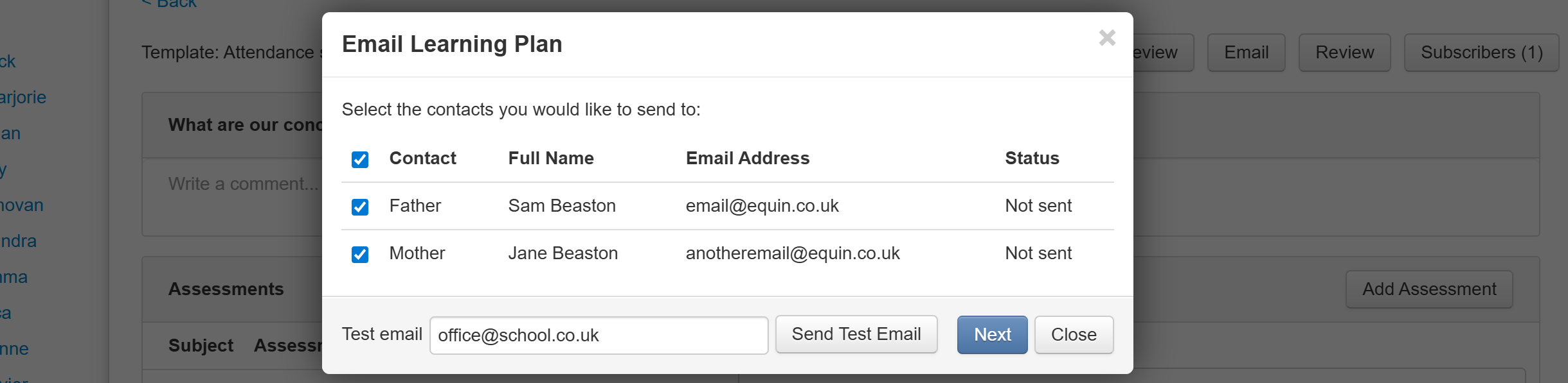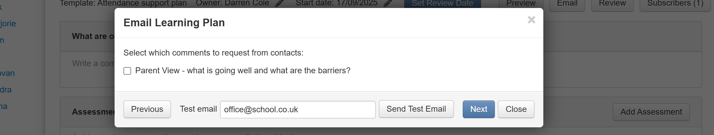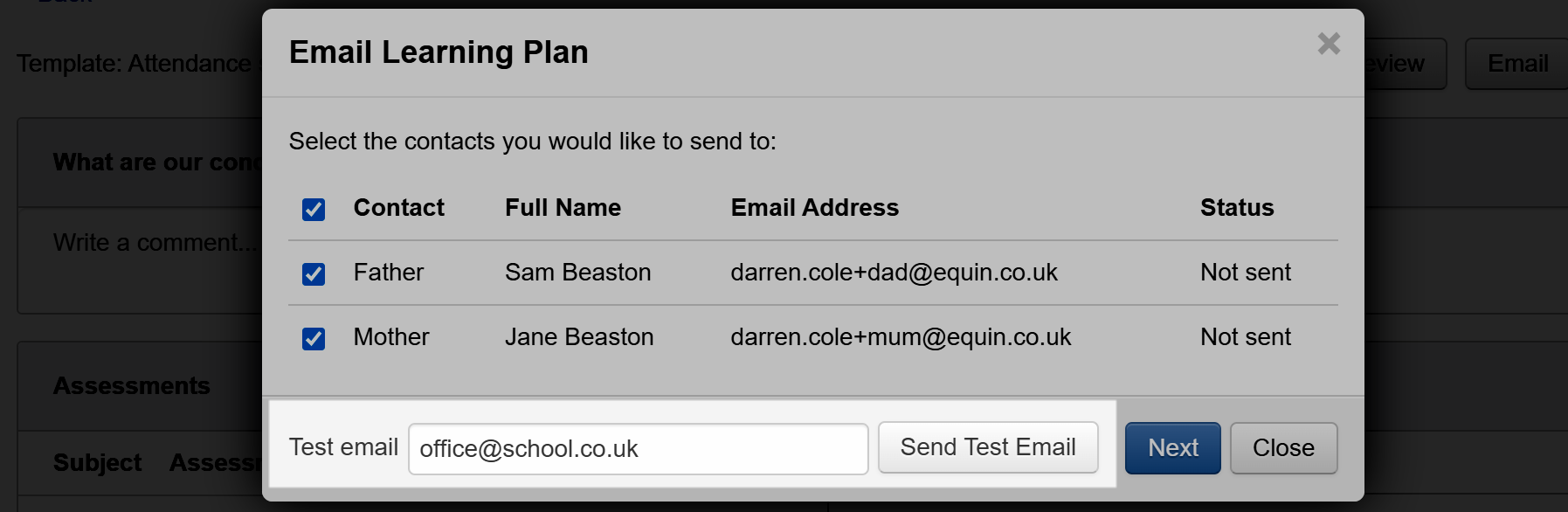 To help with this, it is possible to send a test email when you click the Email button for an individual pupil or via the Learning Plans report.