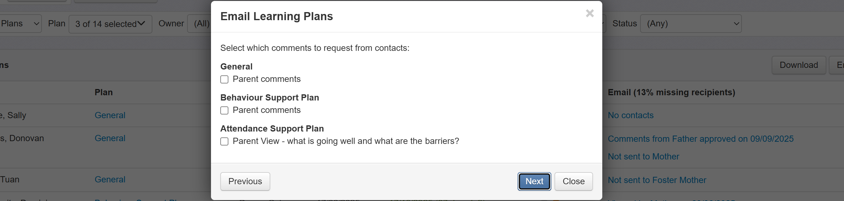 As each learning plan template can have multiple (or no) comment boxes set to allow parent comments, the next screen allows you to select which comment boxes you're inviting the recipients to complete.