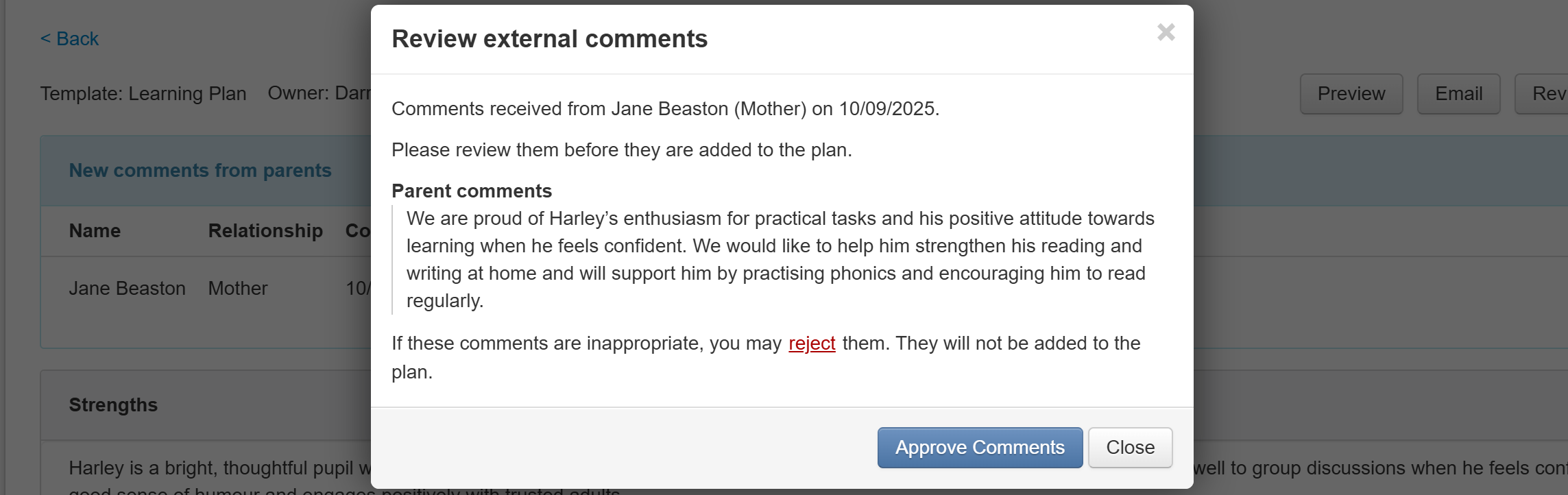 If you're happy with the comments, click Approve Comments to add them to the learning plan.