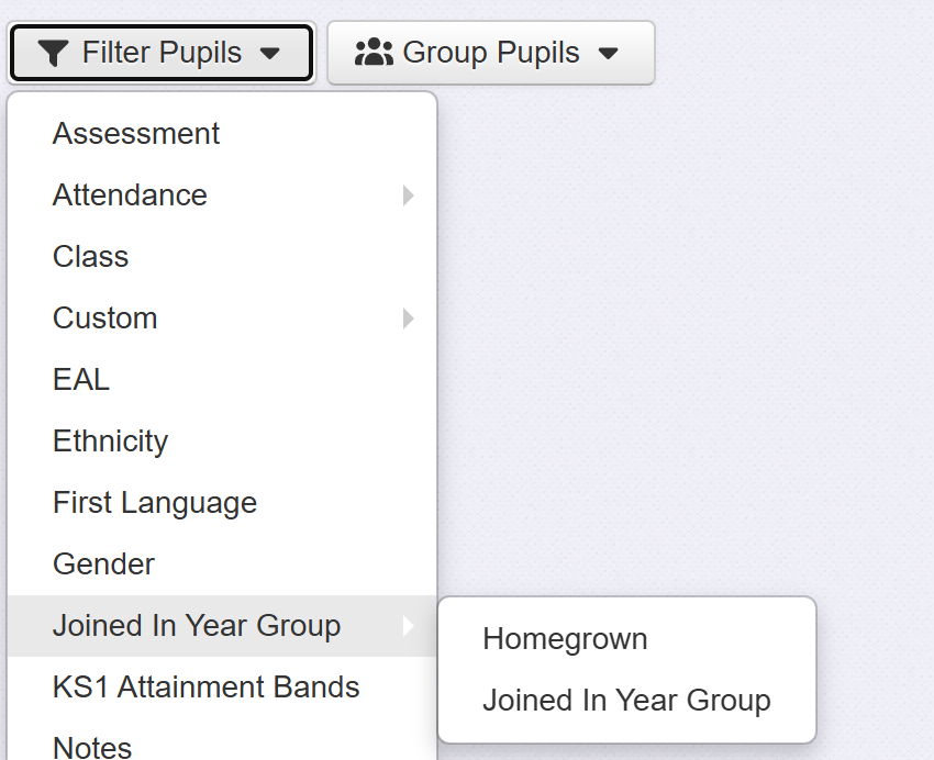 Select Joined In Year Group from the Filter Pupils menu. A sub-menu containing two items will be displayed.