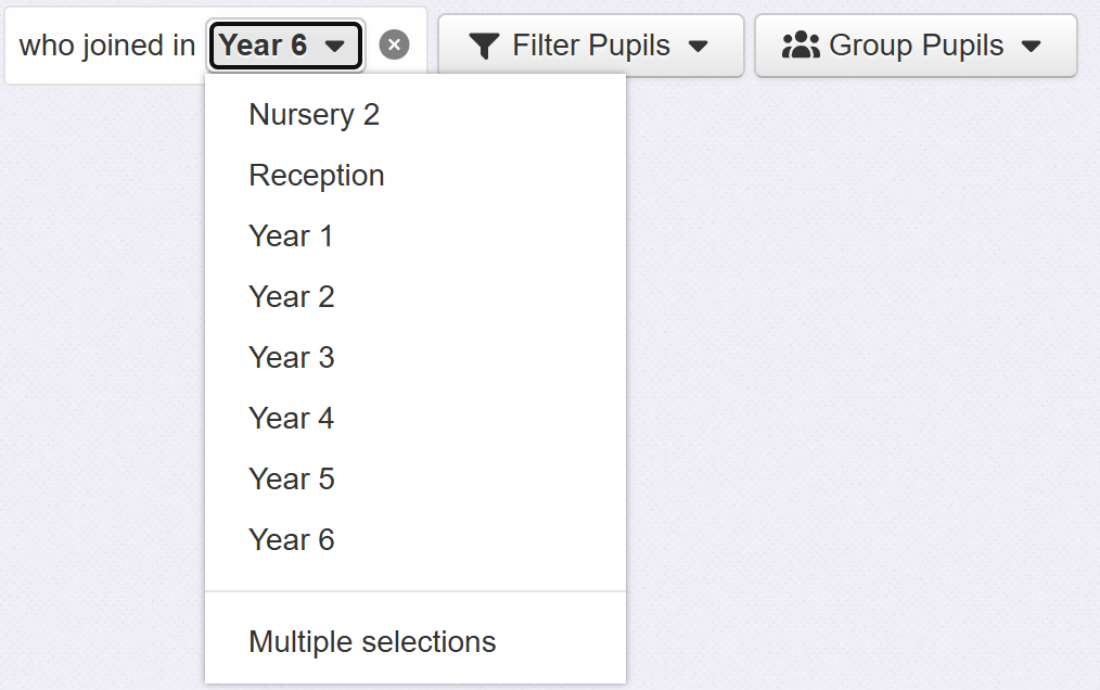 This allows you to filter pupils who started in any year group(s) in your setting