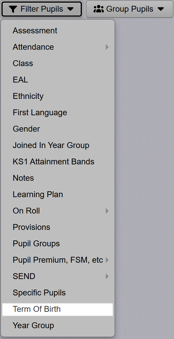 Pupils may be filtered, or grouped, by Term Of Birth.