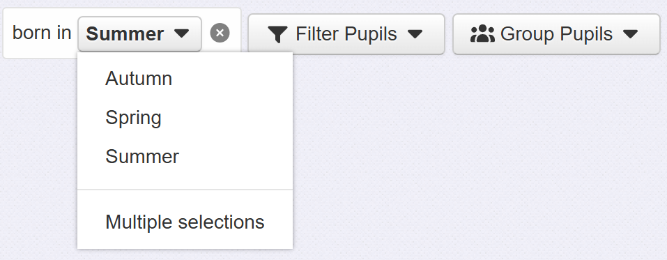 Insight will apply a filter of Summer born pupils, by default, but you can click the born in menu to change it, or make multiple selections.