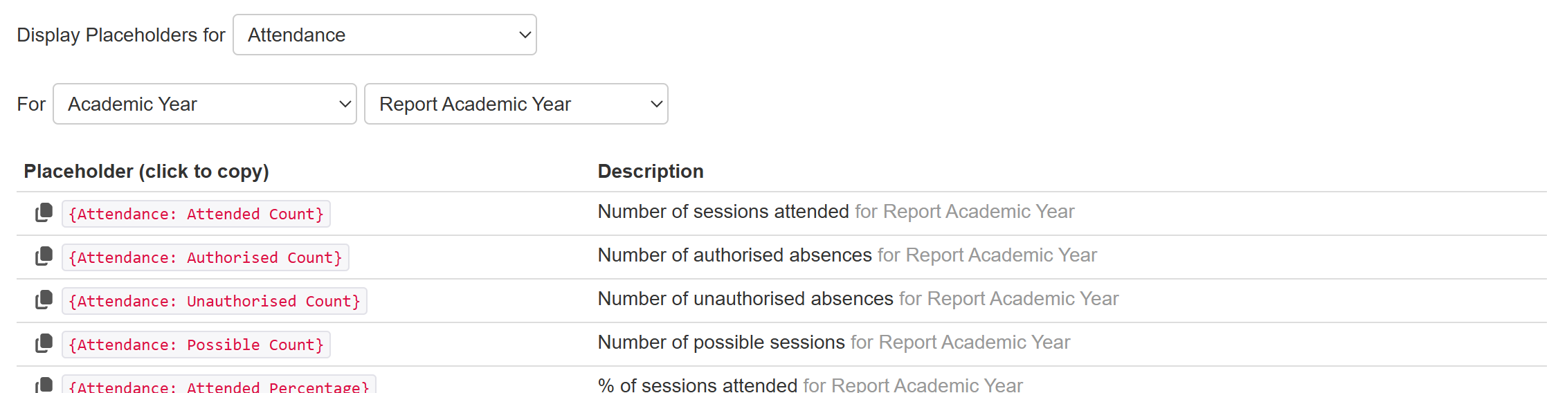 Most of the placeholders insert text. Some will insert graphical images, based on the context of the Pupil Attendance report. An Insight provided template already makes use of these to recreate the majority of that report in a format suitable for sharing as a parent report.