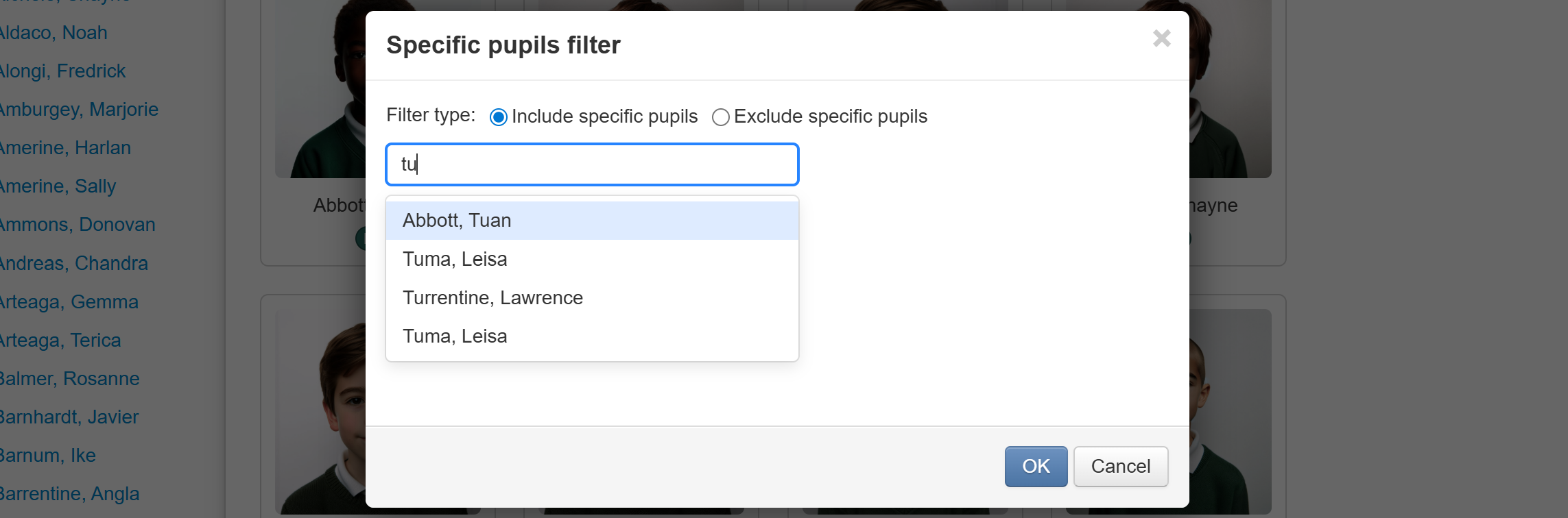 From Filter type, choose Include specific pupils or Exclude specific pupils as required, then click OK to apply the filter.