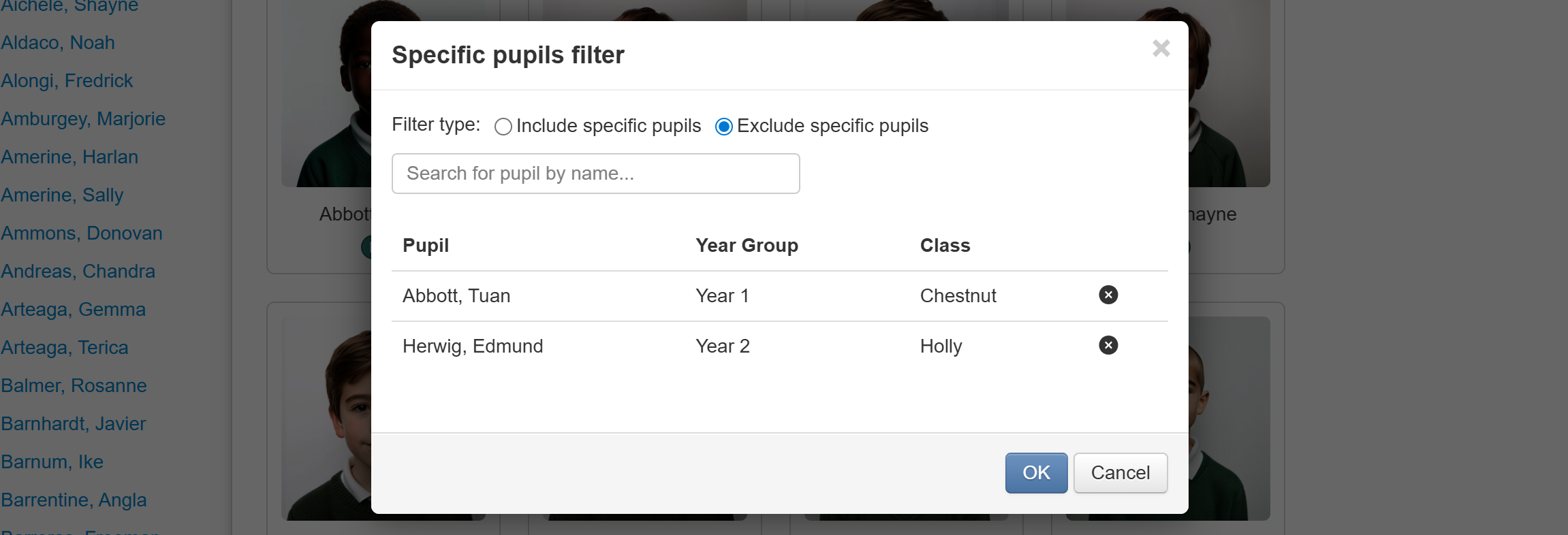 The Specific Pupils filter enables you to only include certain pupils or exclude certain pupils.