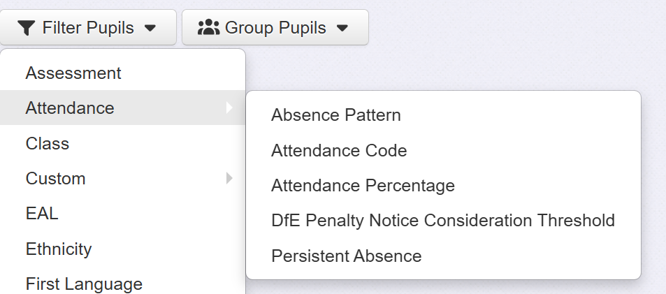 Select Attendance from the Filter Pupils menu. Then click the selection to see the filter options.