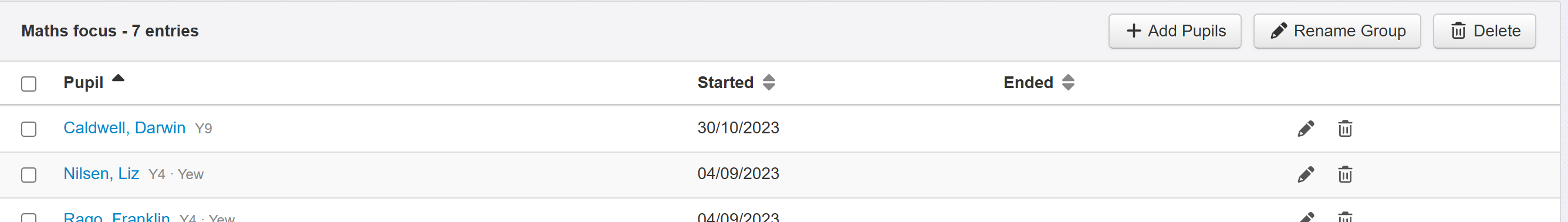 5) You are then asked to set a start date and an (optional) end date for each child. Once you have done this, click Add pupils to group. They will be listed below, where their entries can be edited and deleted.