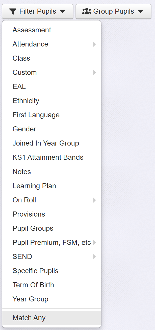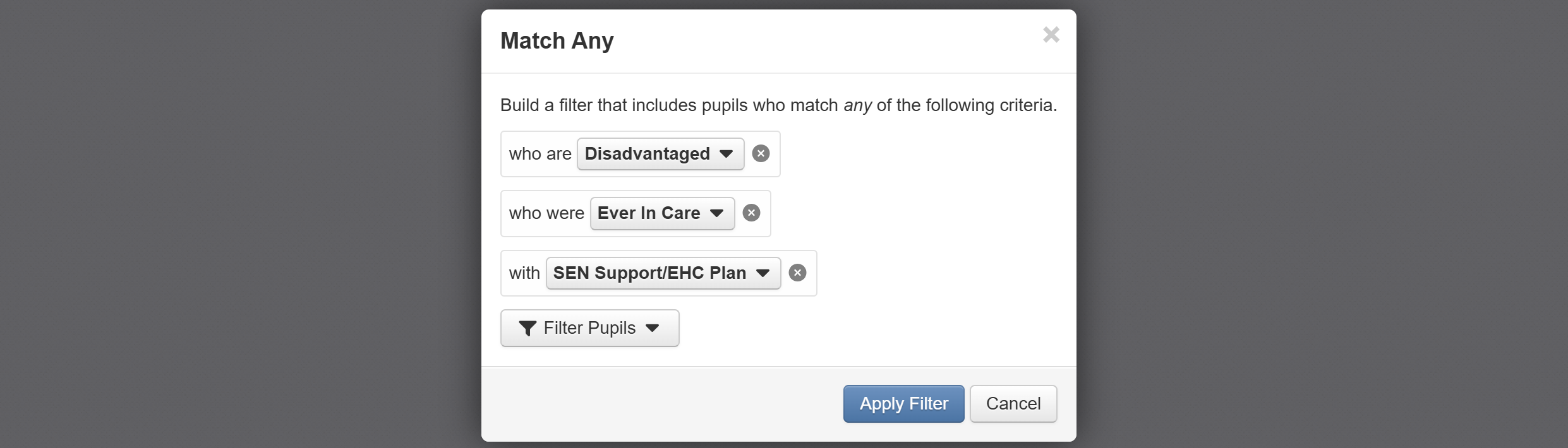 For example, if you wanted a broader filter for Disadvantaged, including pupils In Care or SEN, you could use Match Any to create it.