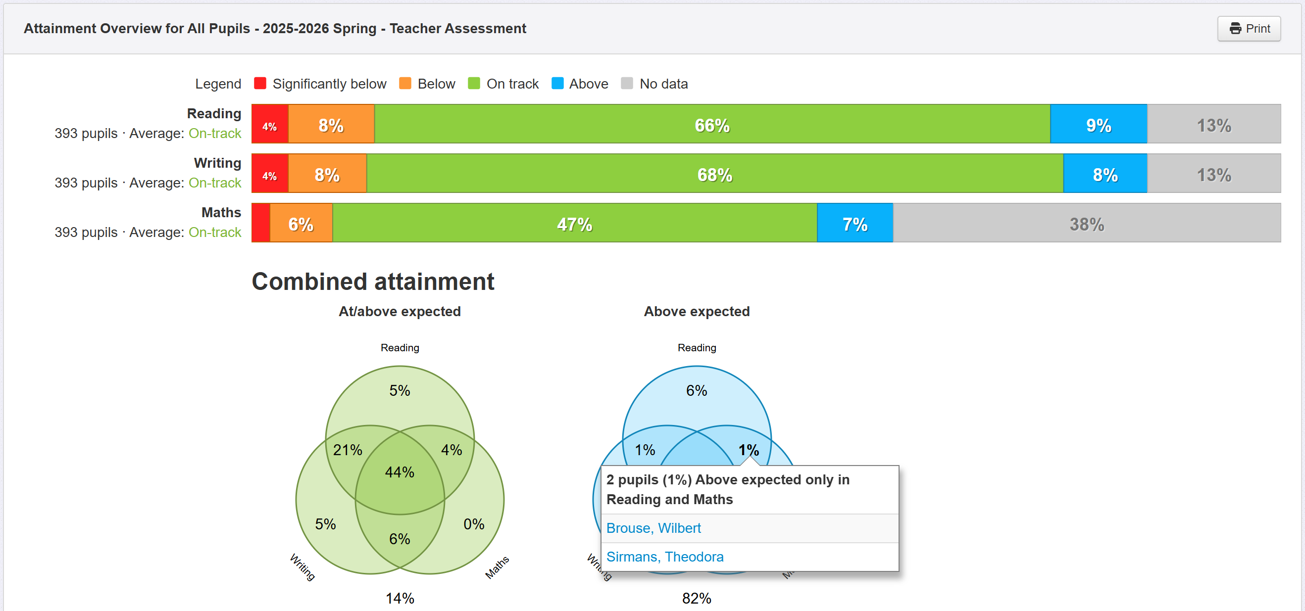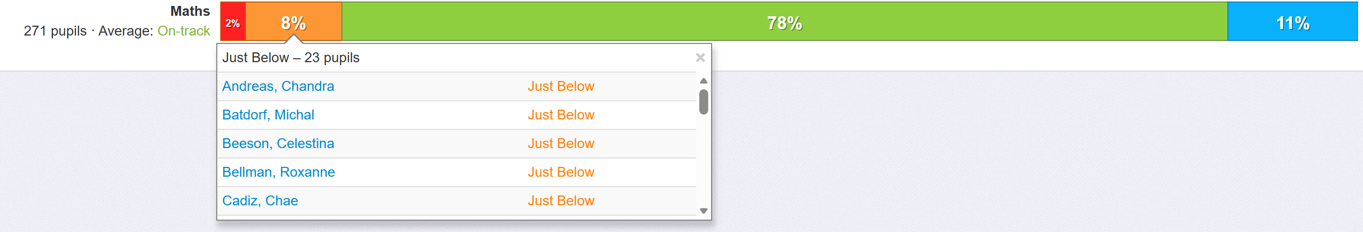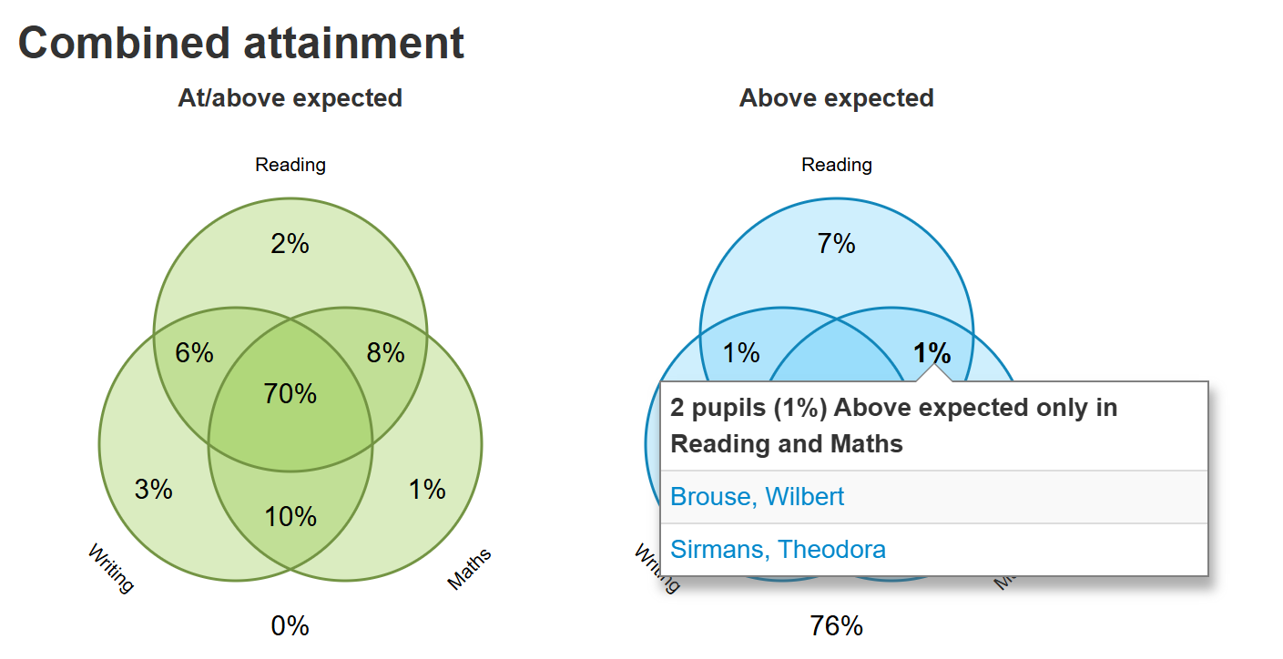 When reviewing data, it is useful to see which pupils are represented by the various sections. Clicking on sections of the bar or Venn diagrams will reveal pupil names.