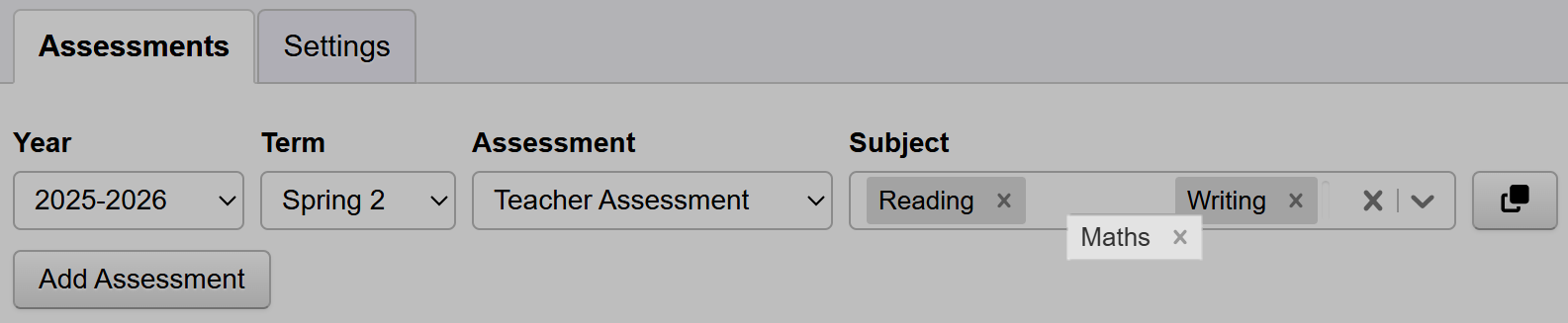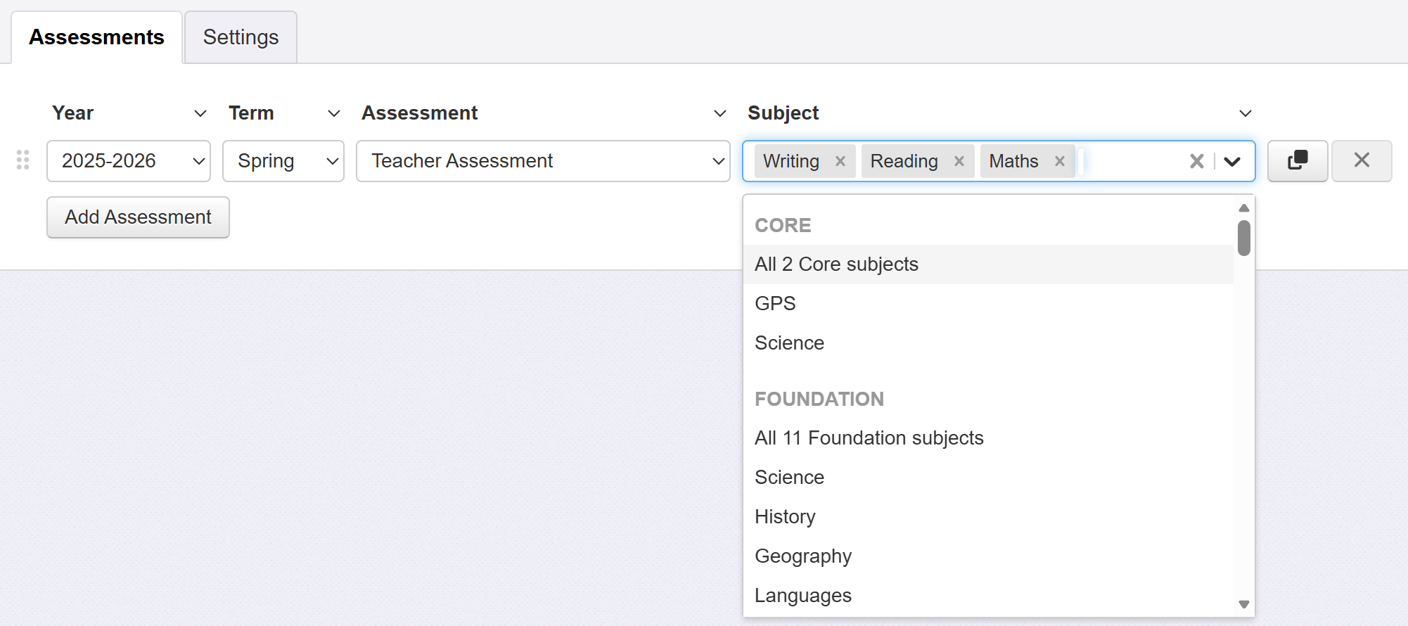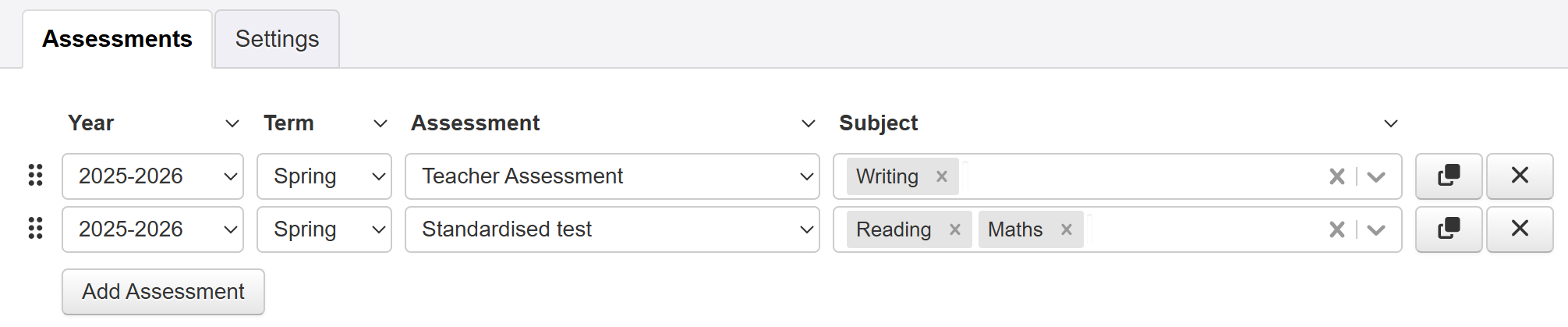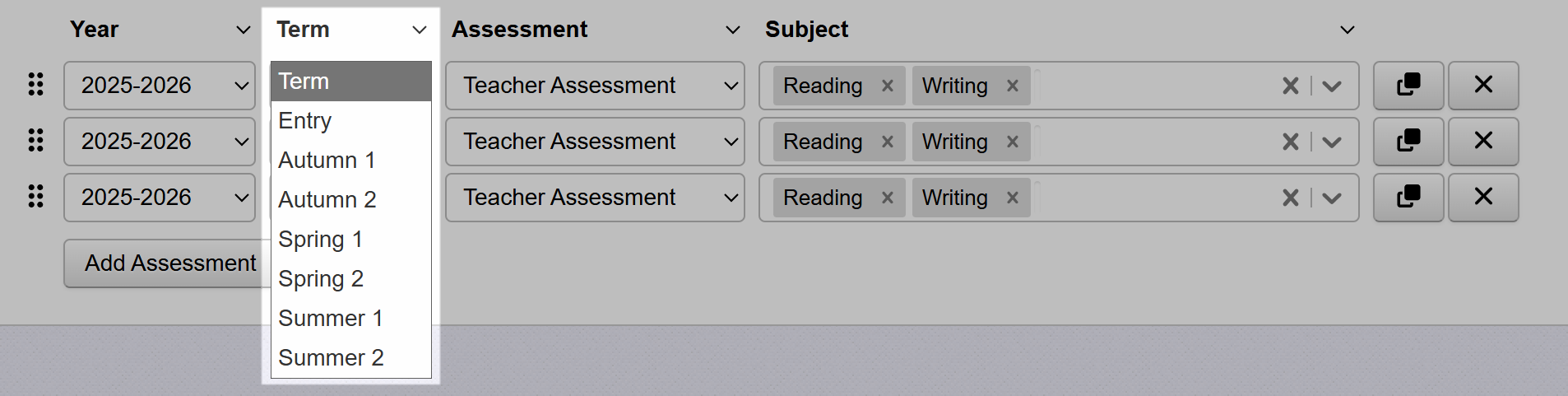 This is where you control which assessments appear in the report. Initially, you'll have a single row with multiple subjects for the same academic year, term and assessment name.