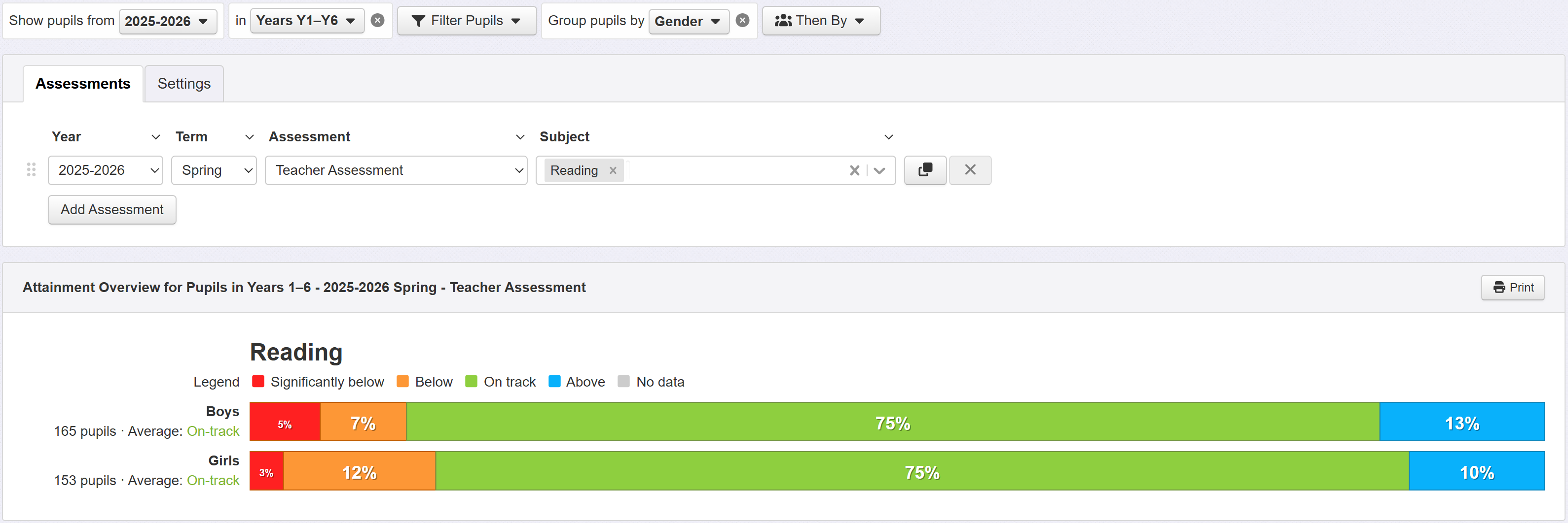 Choose Pupil groups, then assessments to switch this to display in group sections (Boys for example) with any selected assessments (Reading, Writing and Maths for example) within.