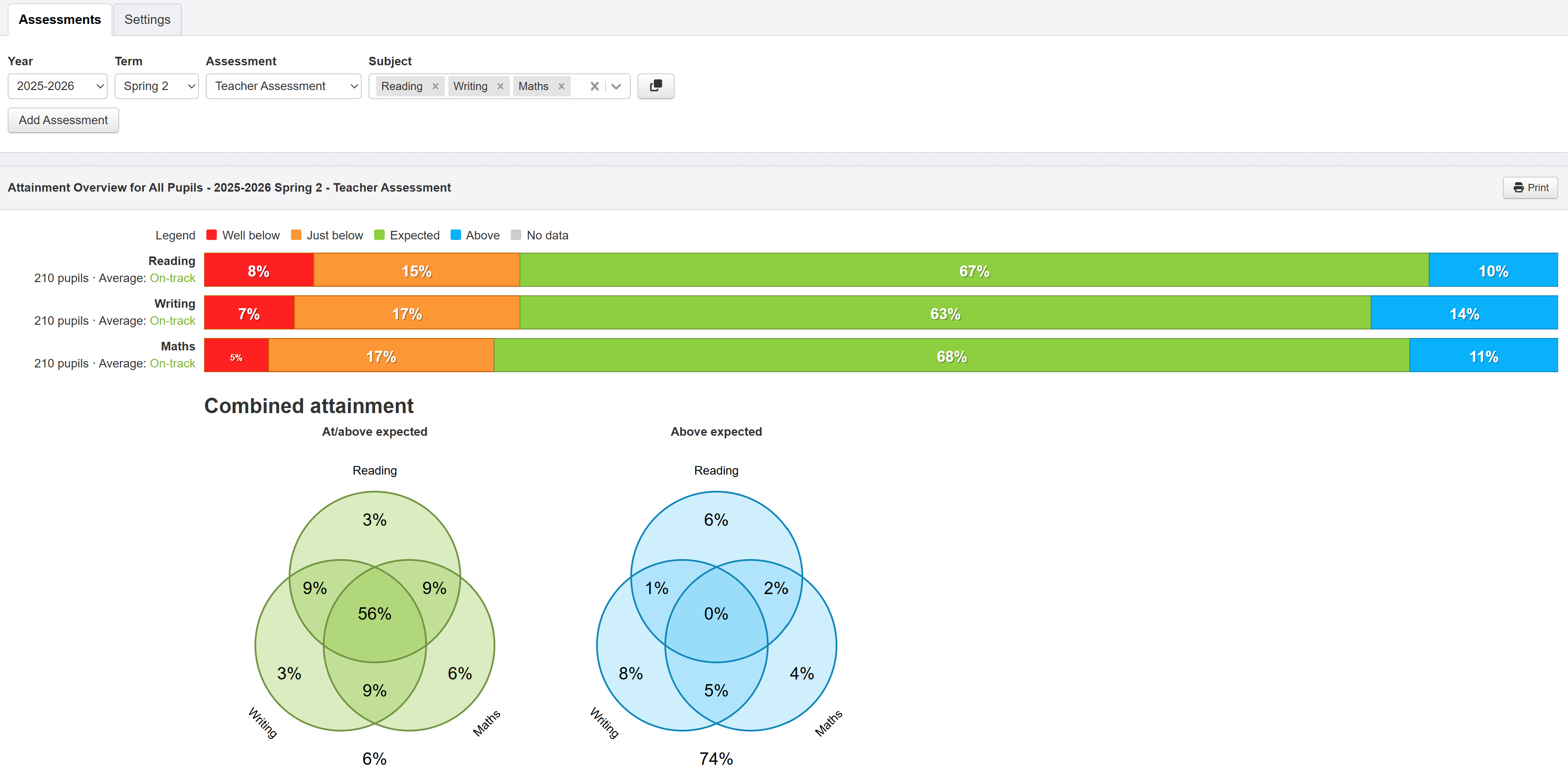 This will load the report with any filters you have already applied with Reading, Writing and Maths for your default assessment name (usually Main or Teacher Assessment).