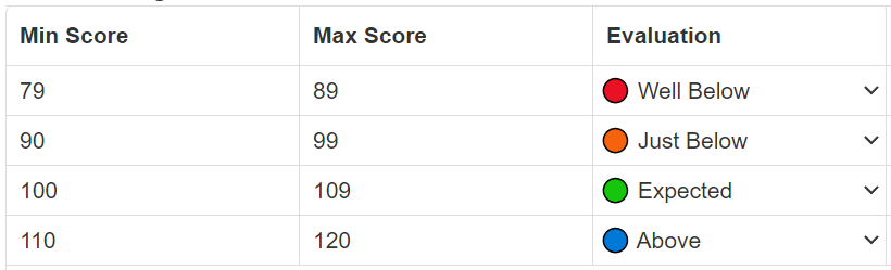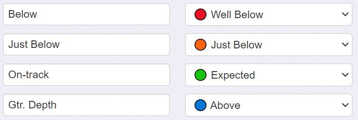 For example, you may have an assessment of Phoneme knowledge, and you might want evaluation thresholds of 0-3 = red, 4-6 = orange, 7-10 = green, 11+ = blue. We can set these up for you.