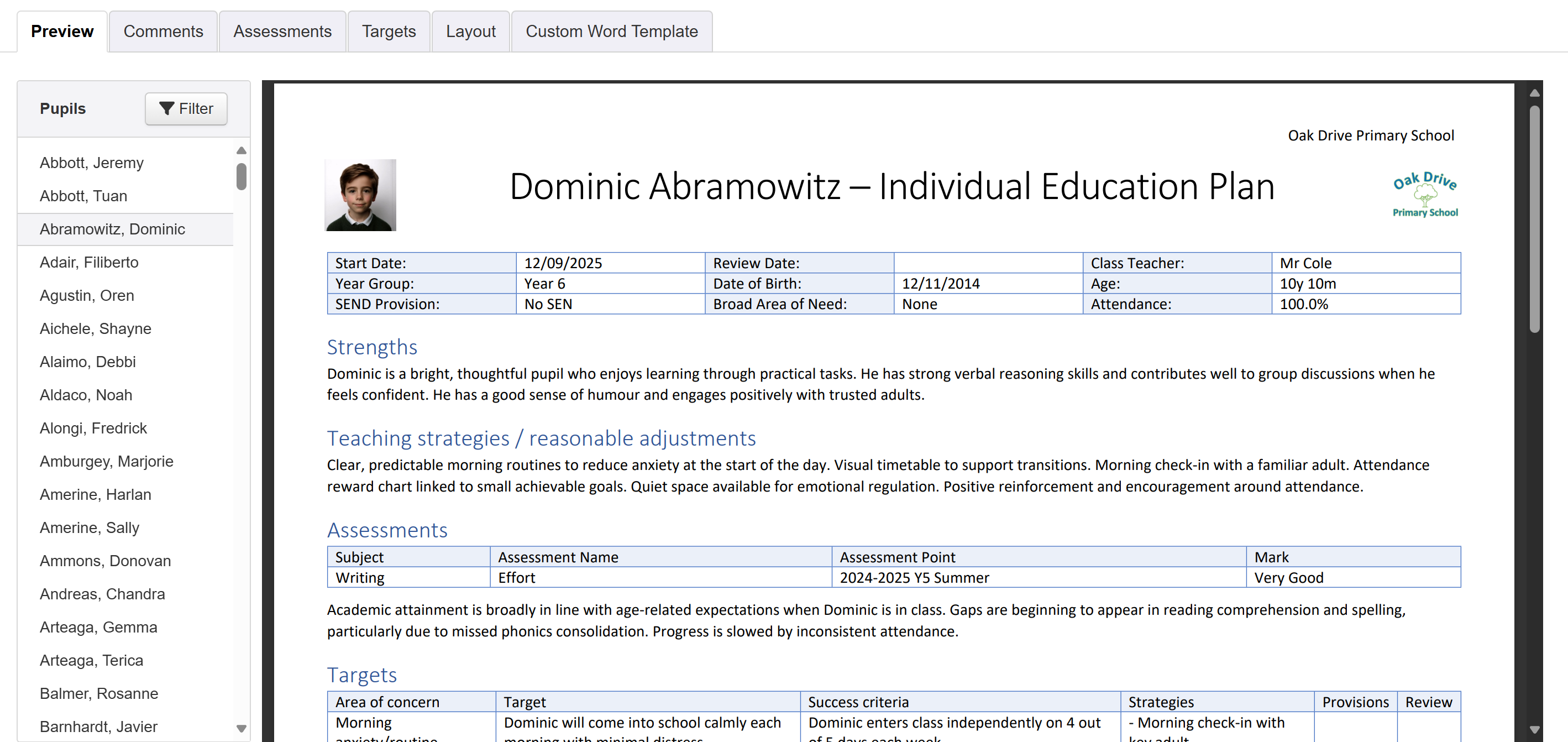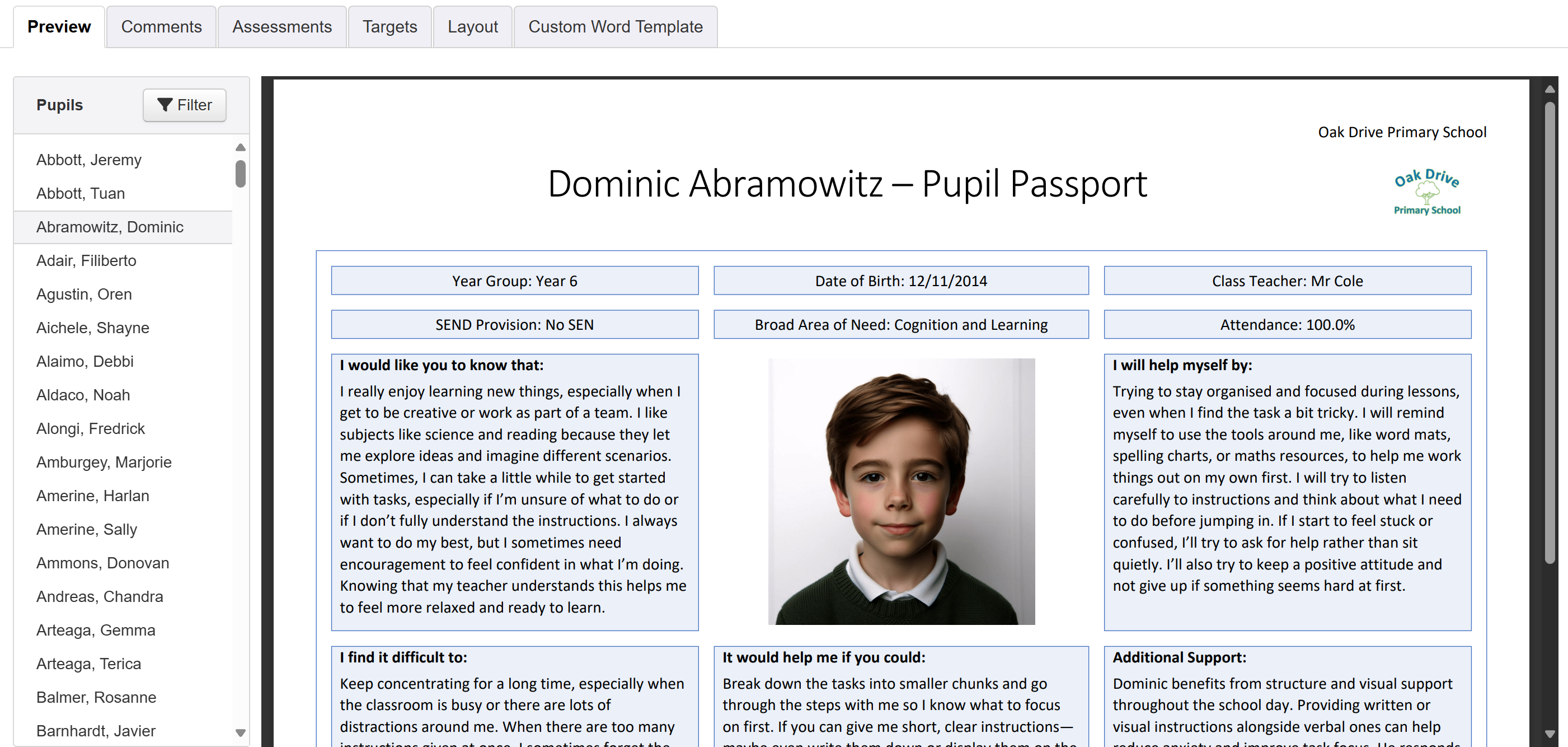 This template is designed to deliver descriptive overviews of a pupil’s strengths, needs, and strategies to support. Sometimes called a Learner Profile or One-Page Profile, this type is useful to share with stakeholders who may be engaging with the pupil concerned.