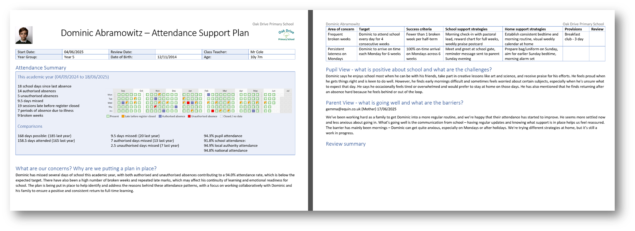 The Attendance plan is designed to deliver requirements for a record of strategies to help improve pupil attendance. It includes a range of details on current attendance and comparisons with the same detail in the previous academic year.