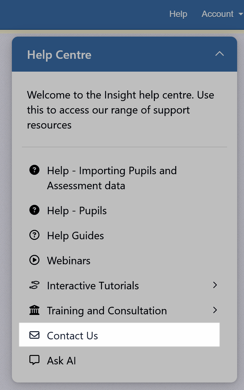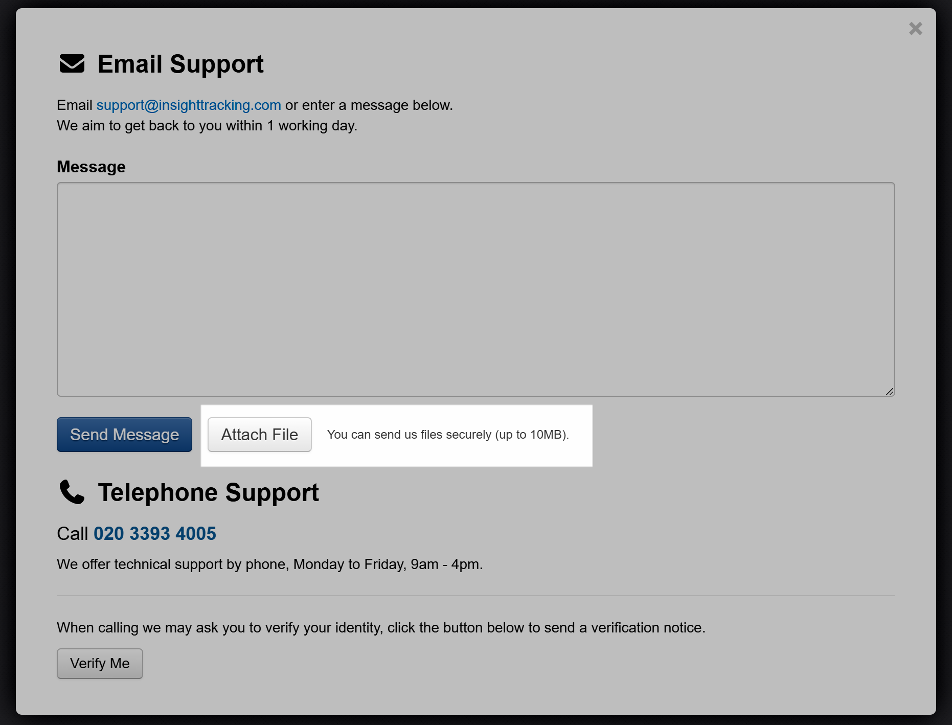This provides you with the contact details but also allows you to message Insight support directly and use the Attach File button to securely send us any file.