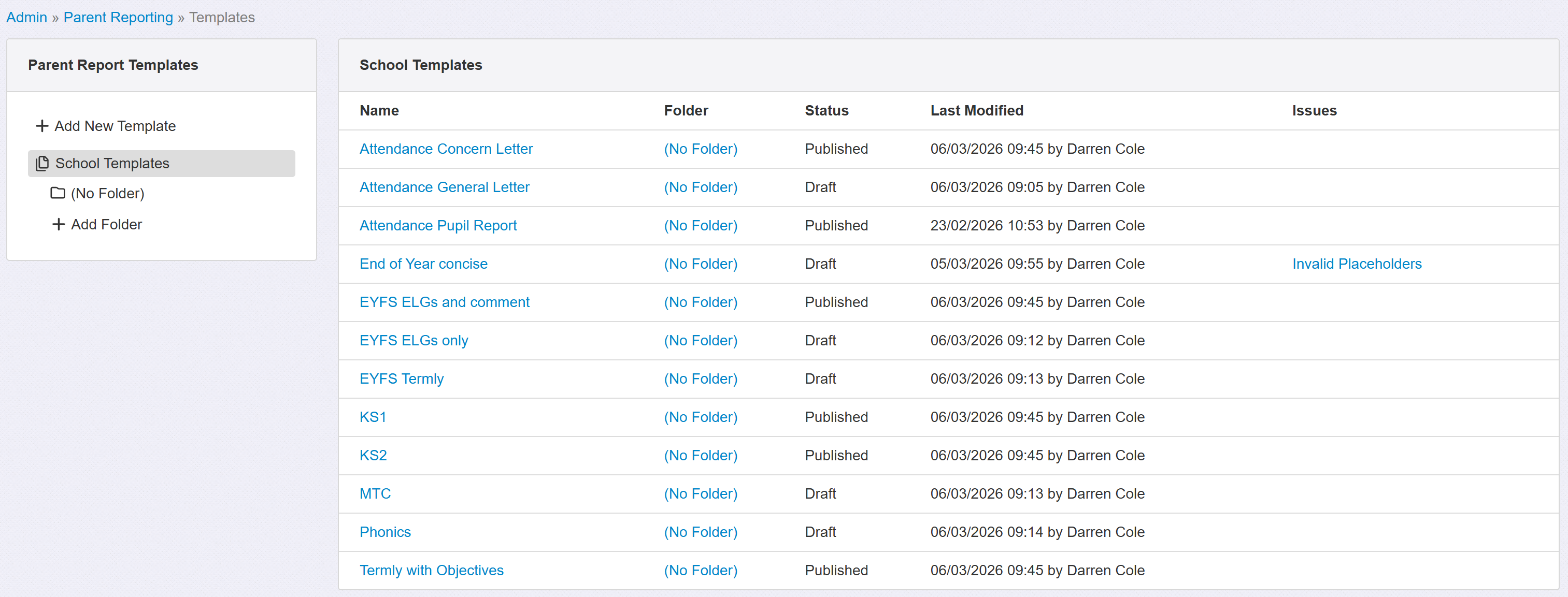 Templates can be set to Draft. This means they are unavailable outside of Admin for users to create pupil reports from.
