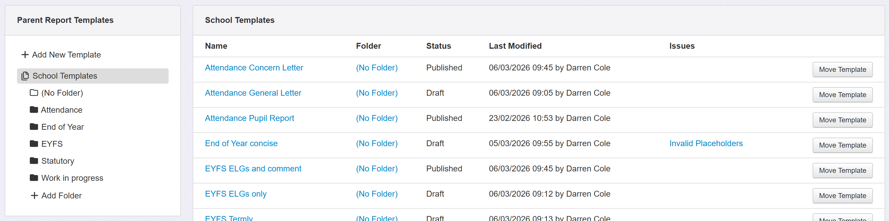 Once you have one or more folders, each template will have a Move Template button on the right of the screen.