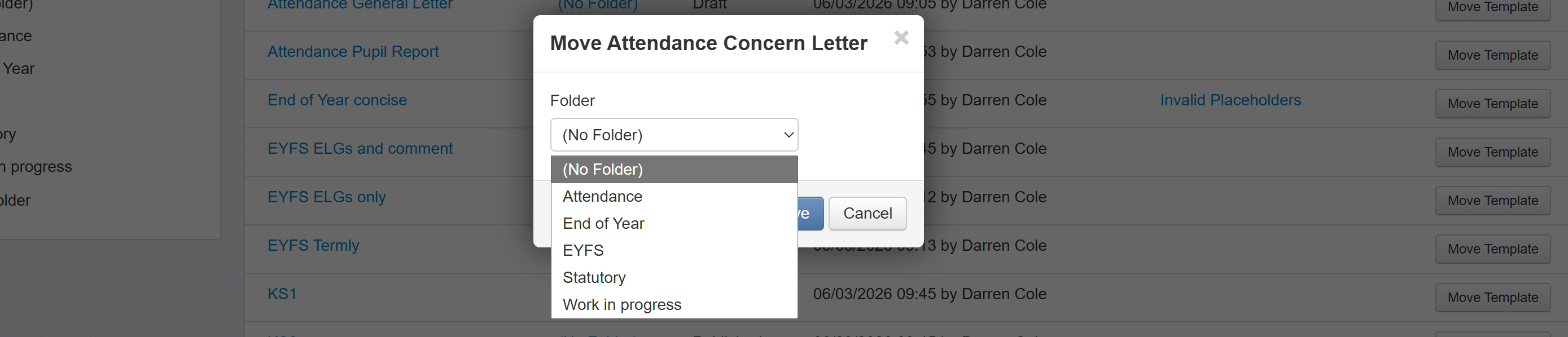 Click the button next to the template you want to move, choose the folder you want to move it to, and click Save.