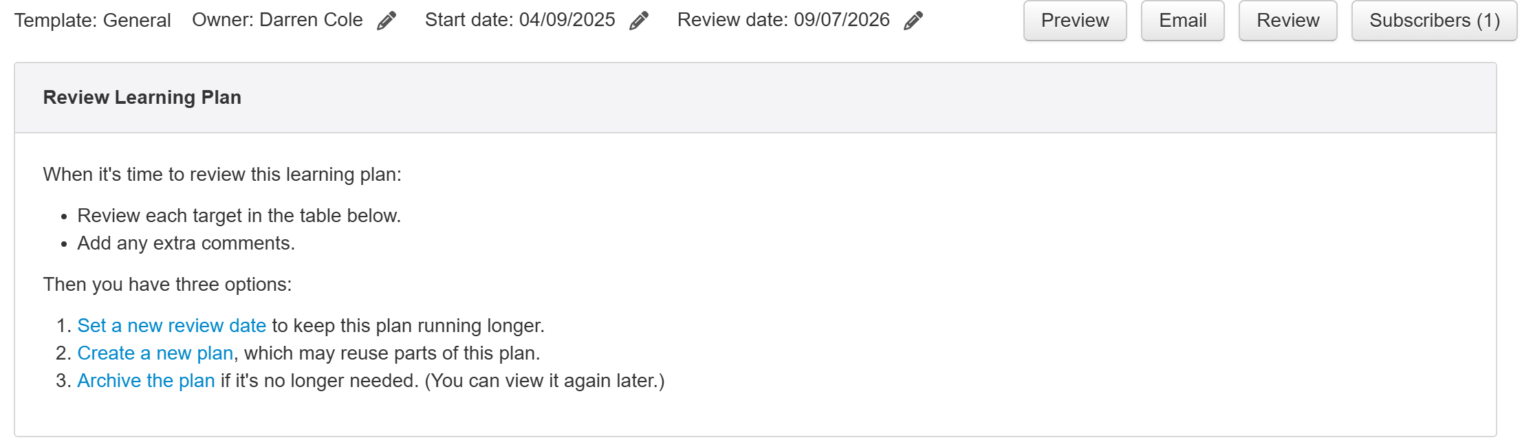 1. Set a new review date to keep this plan running longer - This option treats the learning plan as a working document and is useful if you want to continue to work on the same targets, which may include adding additional ones, and append additional comments.