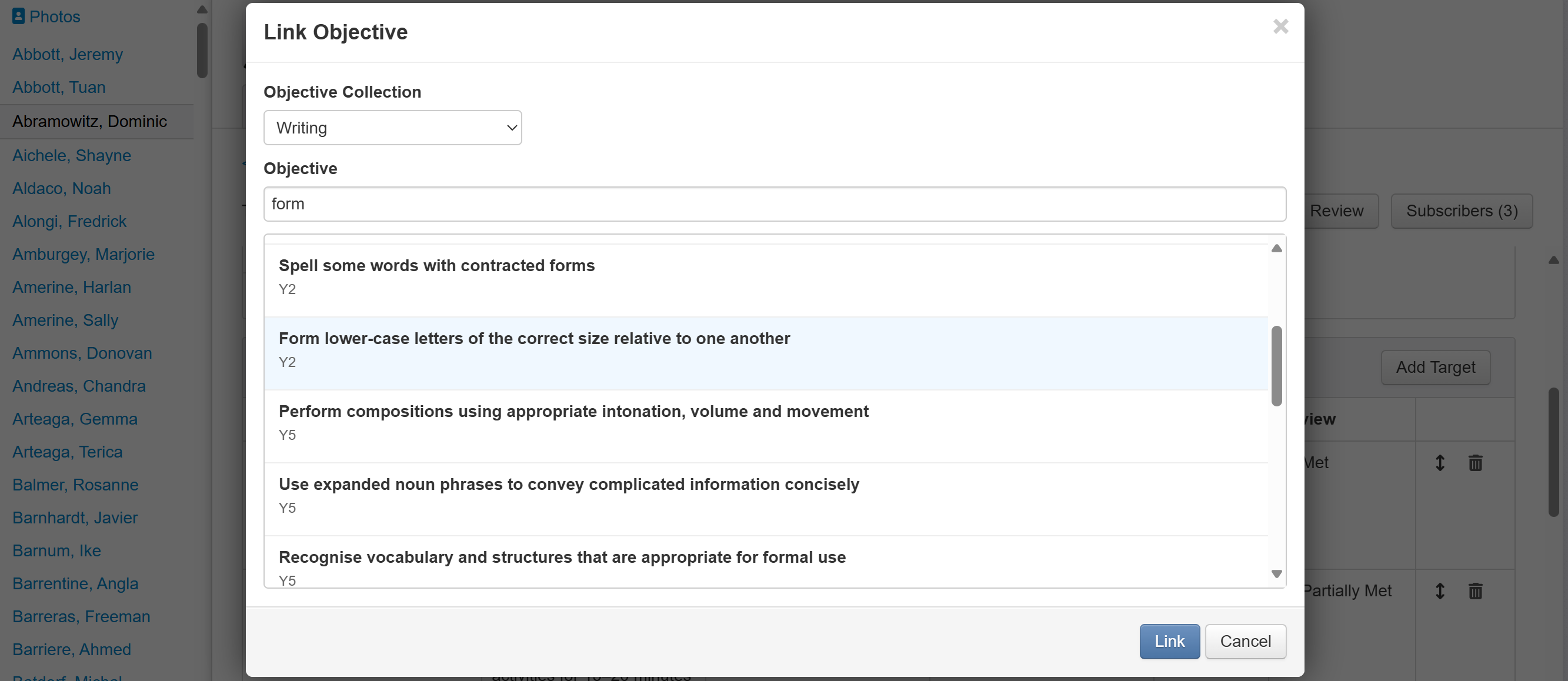 Click Link Objective to begin. This will ask you to select a collection. These will be any of the grids you have available in your school.